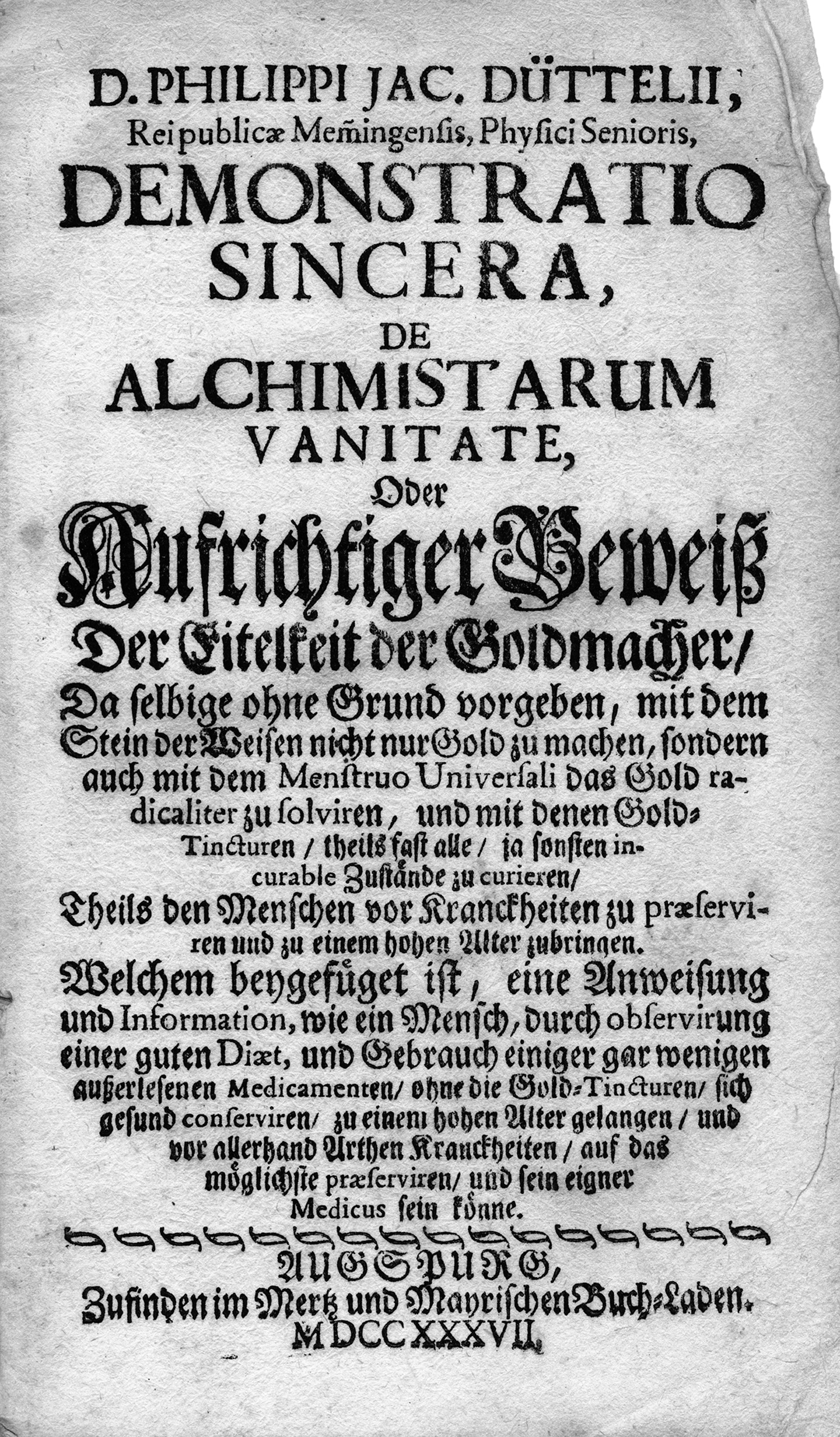 Brüning 4274. Ferchl 133. Ferguson I, 228. Rosenthal 267. – Erste Ausgabe. Philipp Jakob Düttel (1679-1747) aus Nördlingen war Schüler von Friedrich Hoffmann (1660-1742), wurde 1702 in Halle promoviert und war später Stadtphysikus in Memmingen. "Düttels Angriff richtet sich neben den reinen Alchemisten bzw. 'Goldmachern' gegen jene Apotheker, die vorgeben, mit teuren goldhaltigen Tinkturen jede Krankheit heilen und das menschliche Leben verlängern zu können" (Brüning). "His attack, however, on alchemy is such an uncompromising one that it merits consideration in order to learn what a contemporary considered the weak points of the pursuit" (Ferguson). – Innen etwas gebräunt und teils braunfleckig. Kleine Randläsuren. - Selten.