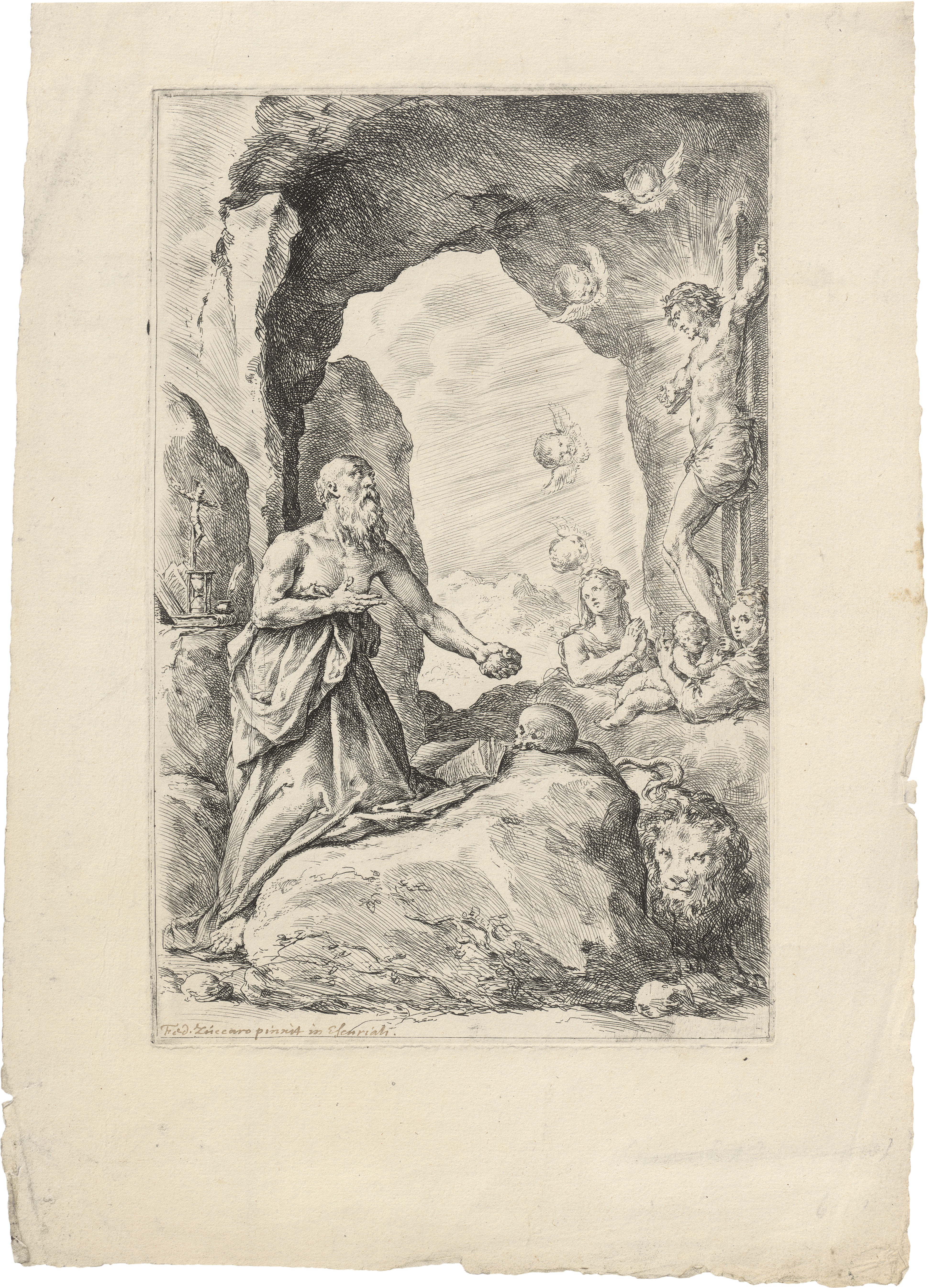 Die Vision des hl. Hieronymus. Radierung nach Federico Zuccaro. 22,5 x 14,7 cm. Hollstein 6. Wz. Wappen von Amsterdam.