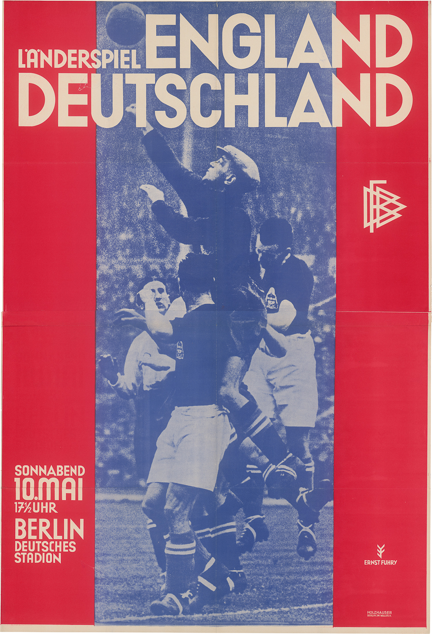 Werbeplakat für das Länder-Freundschaftsspiel Deutschland gegen England. Es war das erste offizielle Länderspiel zwischen der deutschen Nationalmannschaft und der englischen Profi-Auswahl und fand am 10. Mai 1930 in Berlin statt und endete 3:3. Joe Bradford (England) erzielte zwei Tore, Richard Hofmann (Deutschland) drei Treffer. Aufgrund einer Verletzung spielte England in der Schlussphase zu zehnt, da Auswechslungen damals nicht vorgesehen waren. Dieses Spiel markiert den Beginn der sportlichen Rivalität zwischen beiden Nationen. – Im Schriftzug mit hinterlegtem Einriss. Sehr leichte Knickspuren und Einrisslöchlein an den Fälzen, insgesamt wohlerhalten und farbfrisch.