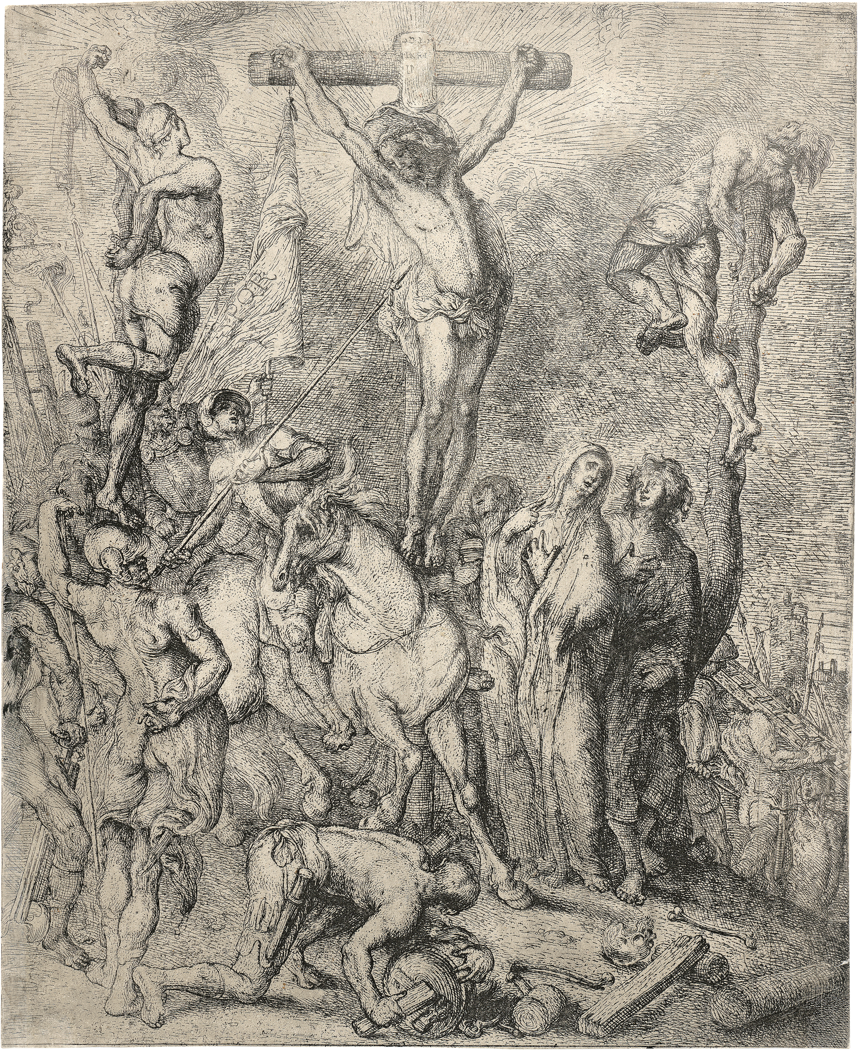 Das experimentell anmutende Blatt war gemeinsam mit einem stilistich eng verwandten Blatt, das eine Grablegung zeigt, Bartsch und zunächst auch Bellini nicht bekannt. Letzerer hat sie im Illustrated Bartsch Giovanni Benedetto Castiglione zugeschrieben. Von beiden Darstellungen gibt es jeweils ein Exemplar in London und Oxford, wo sie unter Castiglione geführt werden. Auf dem Exemplar in Oxford ist im Schriftrand von Hand annotiert: "B. Castiglione fecit et invenit cum privilegio Regis". Den genannten Exemplaren in Oxford liegt eine handschriftliche Notiz bei: "Those puzzling print [sic] must be after drawings by Van Dych, and were probably etched at Genoa, wheter G. Castiglione or not. Nothing authentic is know [sic] about them. Both are in the B.M. under Castiglione. I cannot explain the reference 'W 153'." - Prachtvoller Druck an die Einfassunglinie bzw. die Darstellung geschnitten, unten der leere Schriftrand beschnitten. Etwas angestaubt, schwach fleckig, vereinzelte, kleine punktuelle Ausbesserungen, wie in den Eckenspitzen, nahe des oberen Randes oder in der Inschriftentafel am Kreuz oben, dort teils mit zarten und unmerklichen Federretuschen, weitere Altersspuren, sonst sehr gutes Exemplar. Von großer Seltenheit.