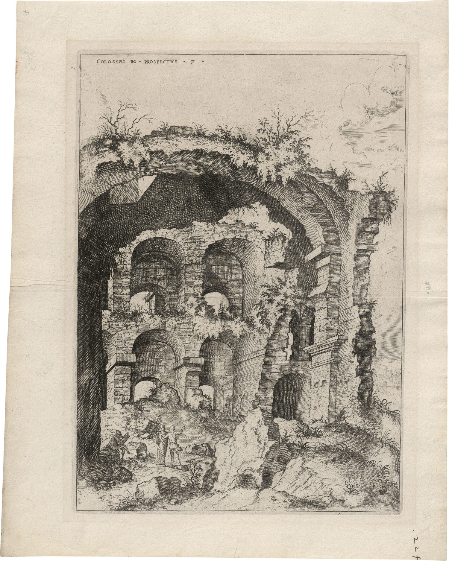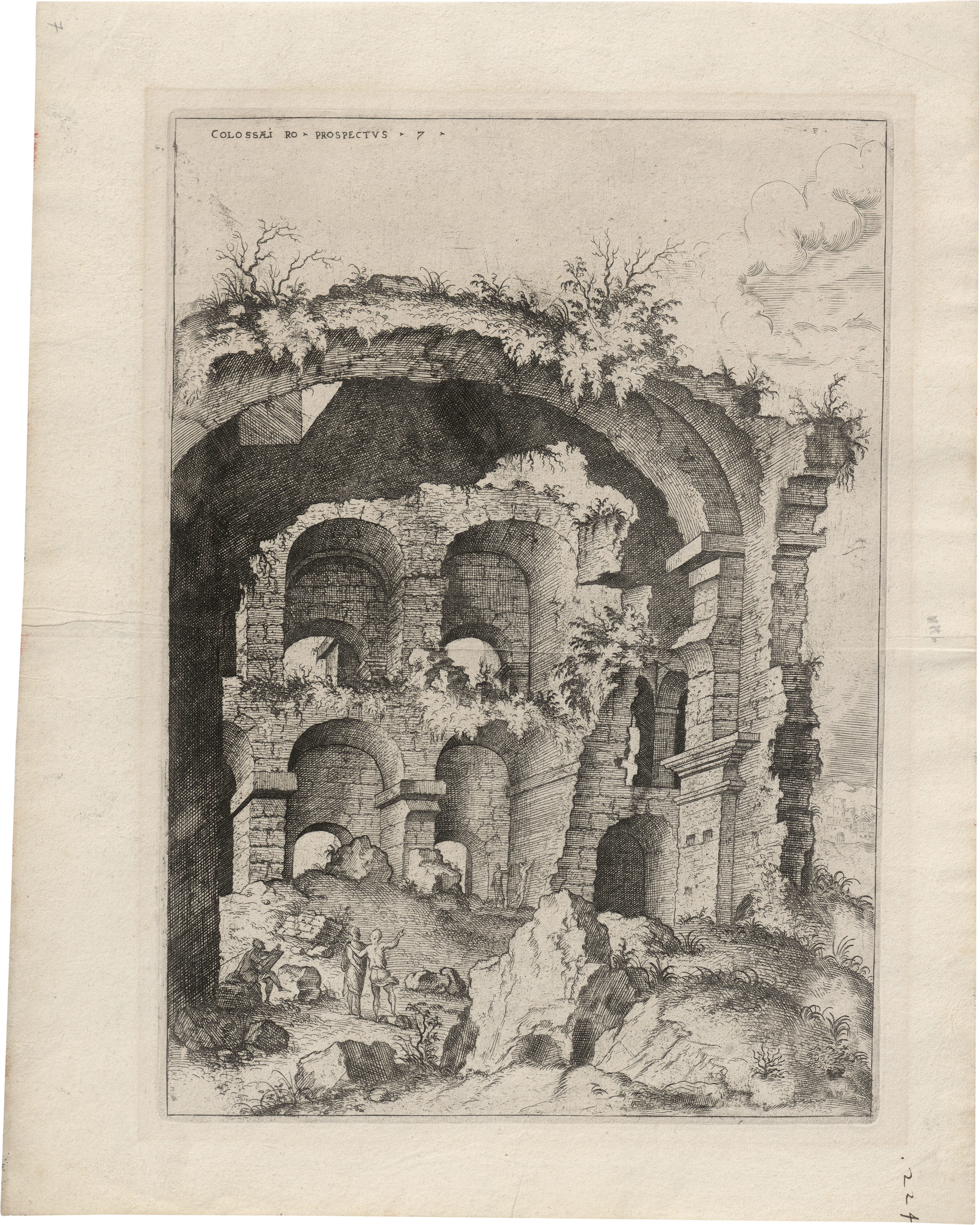 Colossaei Ro Prospectus (Ein Zeichner und Zuschauer vor den Ruinen des Colosseums). Radierung. 31,6 x 22,6 cm. (1550). Hollstein 29 I (von II). Wz. Reichsapfel.
