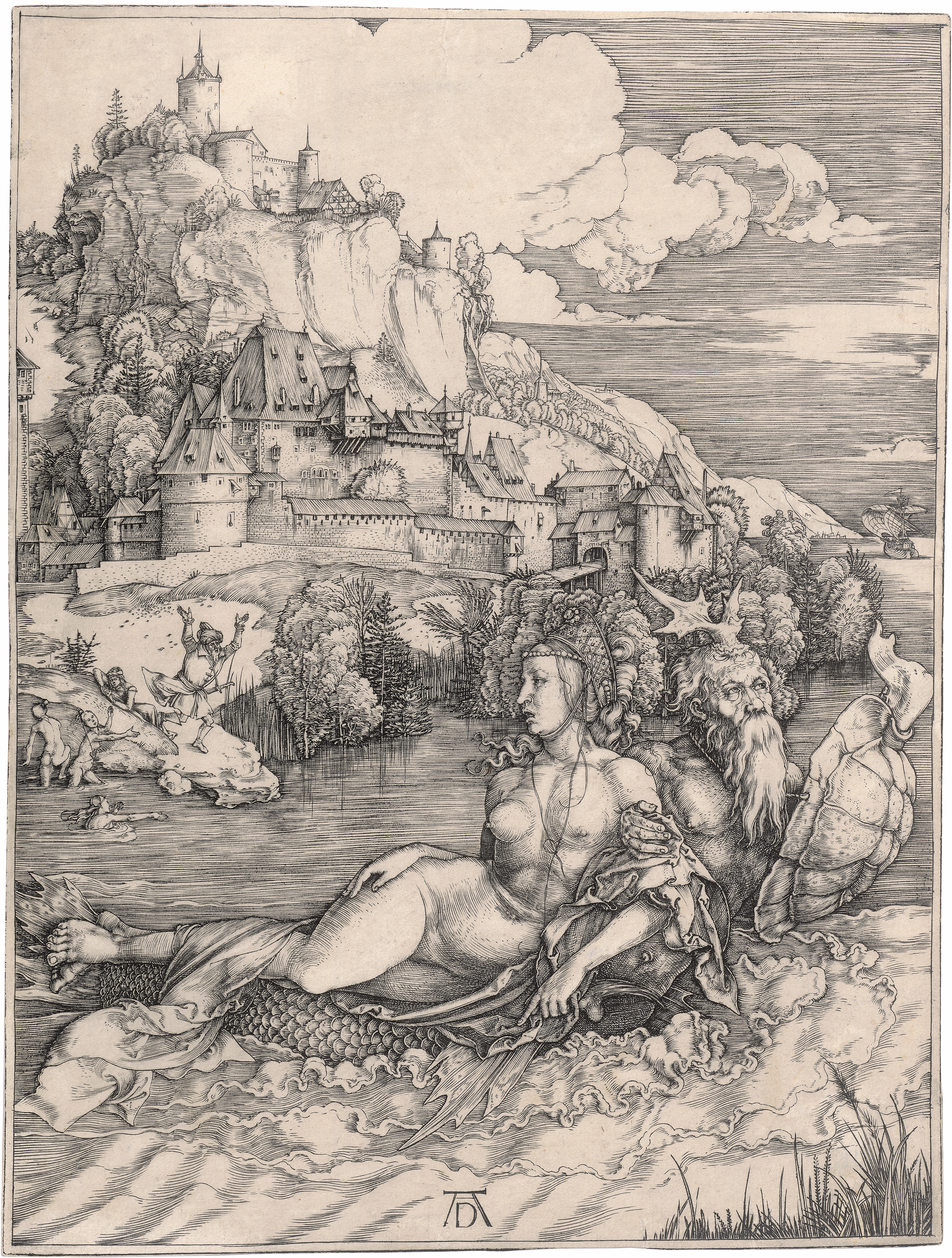 Dürer selbst betitelte das Blatt mit der Darstellung der Entführung einer nackten jungen Frau durch ein Seeungeheuer im Tagebuch seiner Reise durch die Niederlande als "Meerwunder". Das Motiv des Frauenraubs lässt an die Illustration eines mythologischen Themas denken, doch entzieht sich das enigmatische Blatt bis zum heutigen Tag einer eindeutigen ikonographischen Deutung. Dürers eigener Titel trifft jedoch die Quintessenz. Die Darstellung der grazil lagernden Frau - die 300 Jahre vor Ingres' Odaliske das Modellstudium antiker Vorbilder thematisiert - illustriert vermutlich weniger eine bestimmte literarische Vorlage, sondern zeigt eine flüchtige, traumähnliche Vision, in der sich Orient und Okzident scheinbar begegnen.