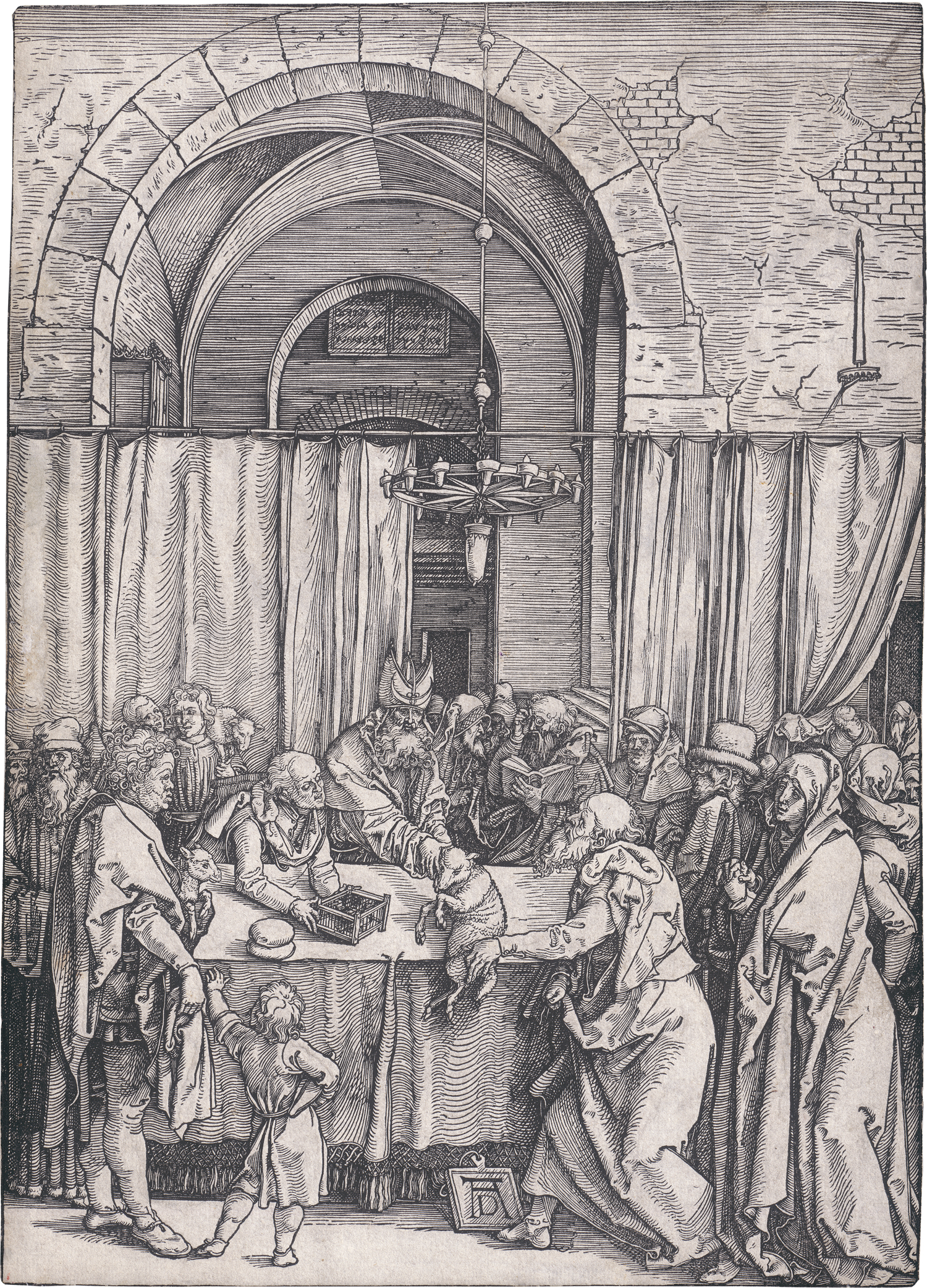Joachim wird vom Hohepriester zurückgewiesen. Holzschnitt aus dem Marienleben, wie auch die folgende Losnummer. 29,3 x 21 cm. Um 1504. B. 77, Meder 189, vor dem Text. Wz. Ochsenkopf (Meder 62).