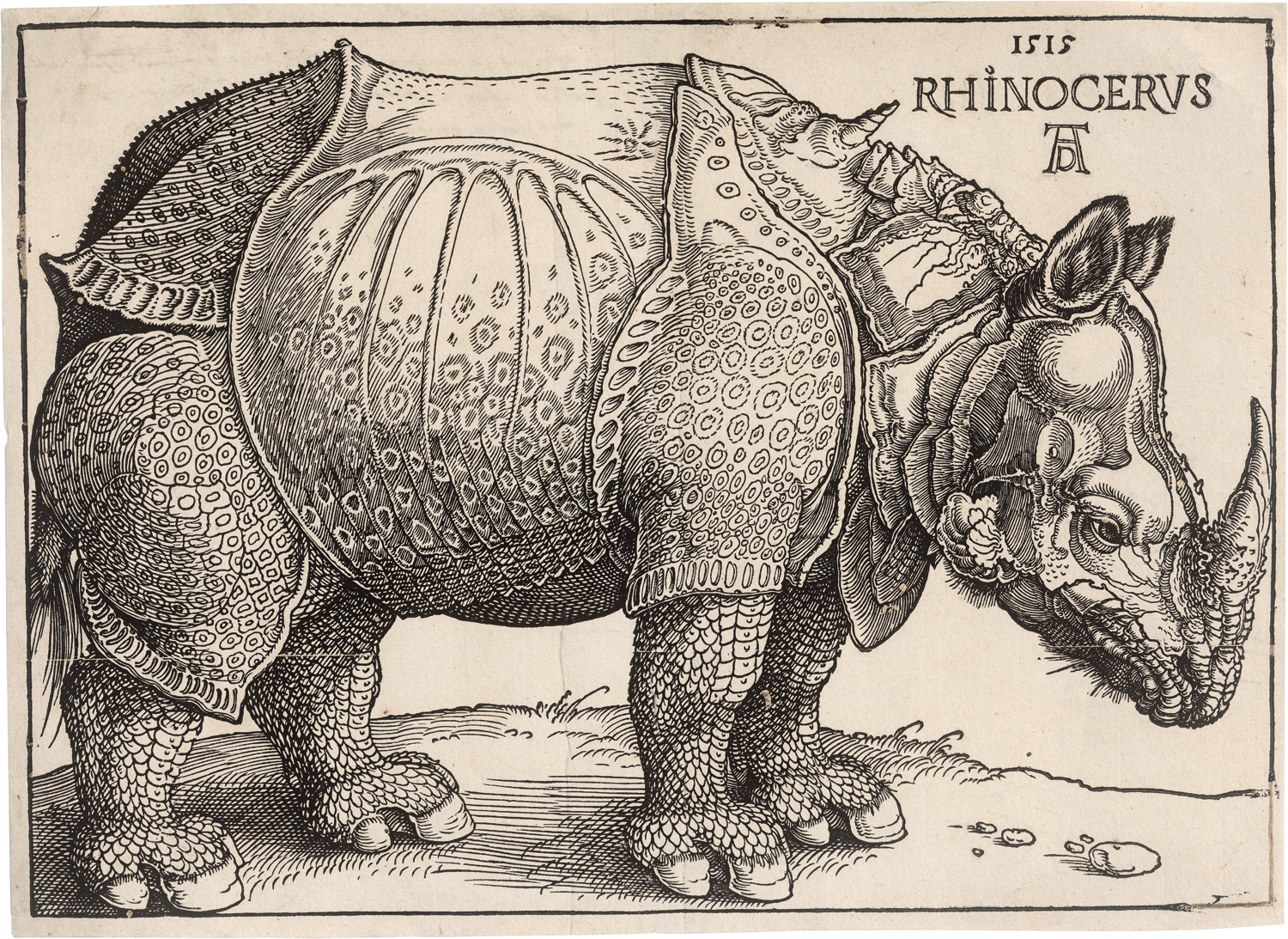Dürers Flugblatt RHINOCERVS unterrichtet über die aufsehenerregende Ankunft eines aus dem indischen Goa stammenden Panzernashorns in Lissabon. Das außergewöhnliche Tier, ein Geschenk des Sultans Mustafa von Gujarat an den portugiesischen Gouverneur von Goa Alfonso de Albuquerque, welcher es wiederum König Manuel I. von Portugal schenkte, erreichte Portugal im Mai 1515. Von dort aus trat es eine weitere Seereise Richtung Rom an, wo es dem Papst übergeben werden sollte. Es erreichte die Ewige Stadt jedoch nie, da das Schiff vor der ligurischen Küste zerschellte und mit dem angeketteten Tier unterging.