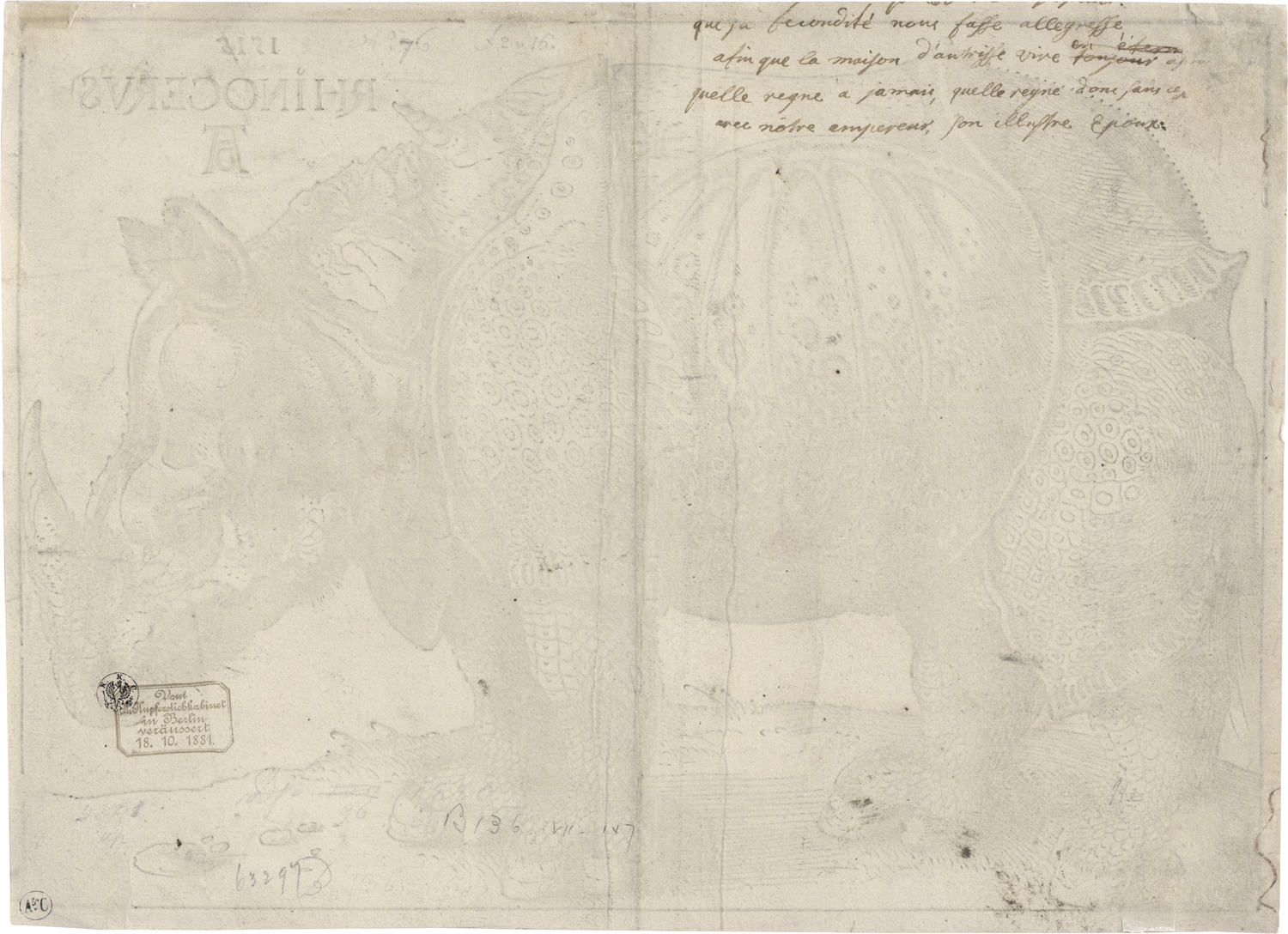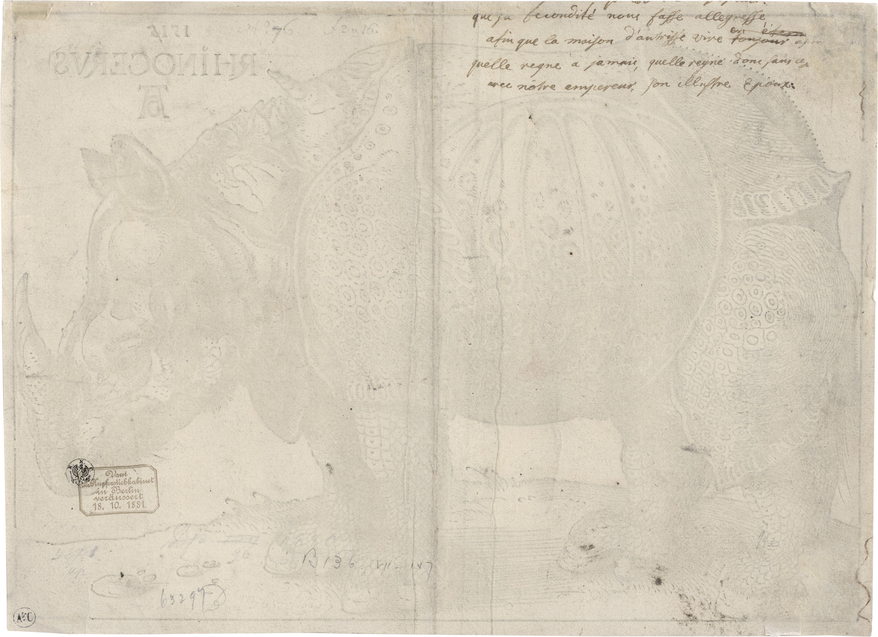Die ikonische Darstellung des Rhinozeros, das auf einem nach Nürnberg gesandten Bericht mit illustrierender Federzeichnung basiert, sollte zu einem der erfolgreichsten und meistverkauften Holzschnitte Dürers werden. Das Blatt, das bereits im 16. Jahrhundert in hohen Auflagen gedruckt wurde, erschien bis ins 17. Jahrhundert in mindestens acht Druckkampagnen. Der Holzstock, der bereits von Abnutzungspuren gezeichnet war, wurde schließlich um 1620 erst von Hendrik Hondius und dann von dem Verleger Willem Janssen erworben. Unser Exemplar zeigt bereits Zeichen der 8. Ausgabe wie den Sprung durch alle Beine und den Rüssel sowie einzelne, winzige Wurmlöchlein, wobei es ein Wasserzeichen trägt, das Meder für die 6. Ausgabe von Hendrik Hondius vermerkt hat.