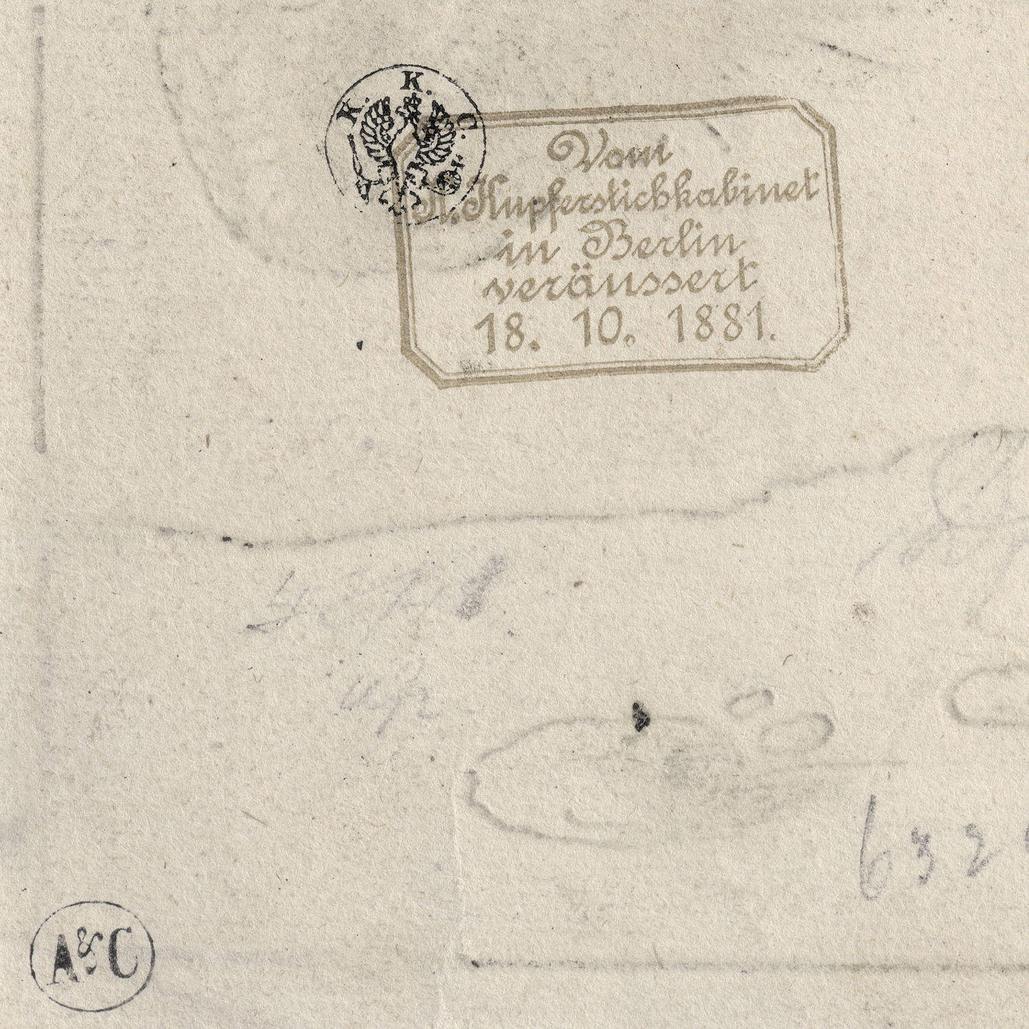 Aus der Sammlung Artaria & Co. Wien (Lugt 90, Stempel um 1820 ursprünglich verwendet für die besten und qualitätsvollsten Drucke) sowie aus dem Kupferstichkabinett der Staatlichen Museen zu Berlin (ehemals Königliches Kupferstichkabinett), mit deren Dublettenstempel vom 18. Oktober 1881 (Lugt 1632 und 234).