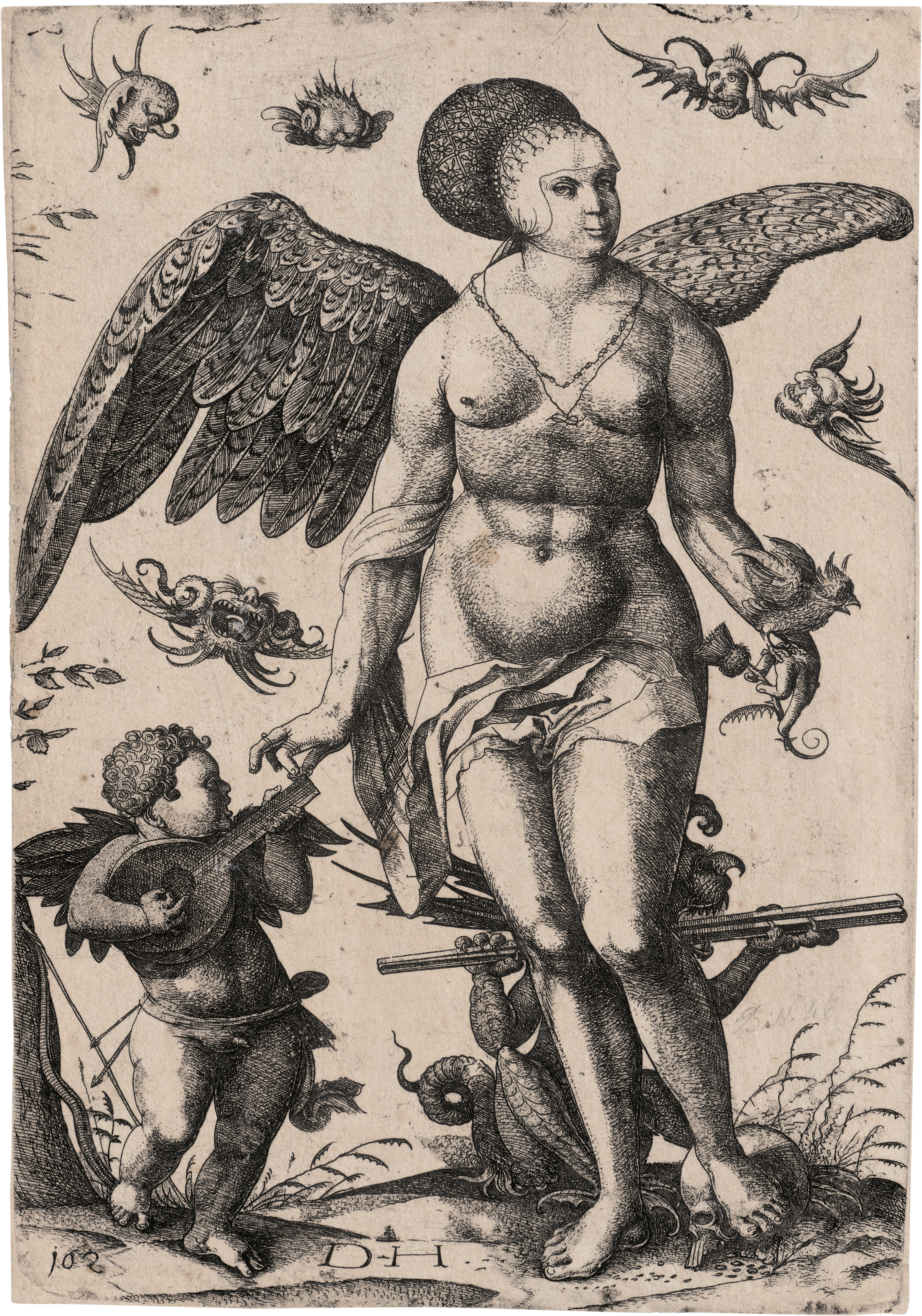 Mit der Funck-Nummer. Ganz ausgezeichneter, satter Druck, die Plattenkante meist sichtbar, oben und unten partiell bis an die Darstellung beschnitten. Geringfügig gegilbt und fleckig, kleine hinterlegte Läsur mit Klebespuren im rechten Flügel der Venus, weitere kaum merkliche Ausbesserungen sowie ein sehr kurzes Einrisschen in der Ecke oben rechts, isolierte Faserspuren, verso schwacher Gegendruck desselben Motivs, sonst in schöner Erhaltung. Aus der Sammlung der Staatlichen Graphischen Sammlung München (Lugt 2723 und wohl Lugt 1613 (undeutlich)).