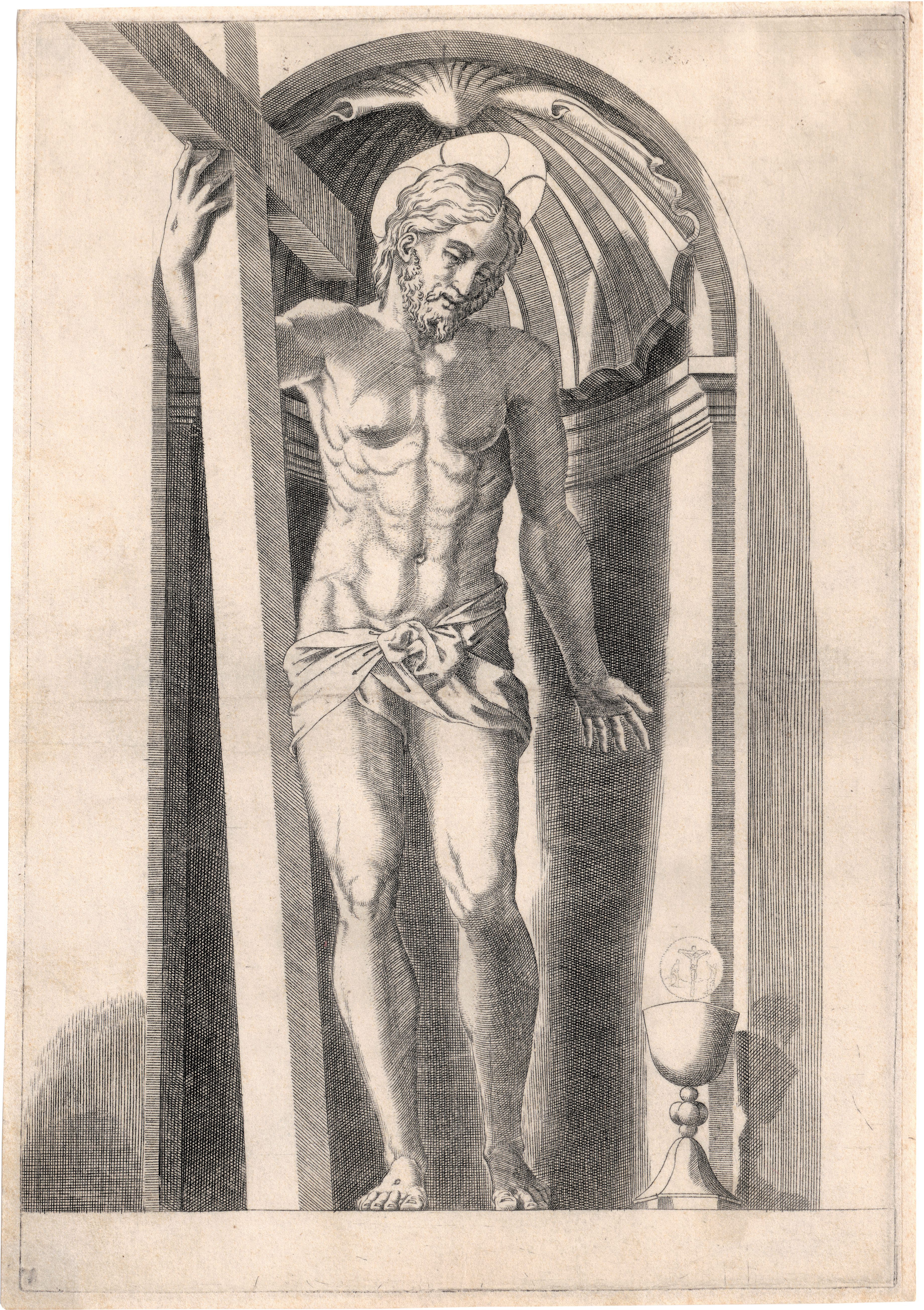 um 1540. Christus mit dem Kreuz und dem Abendmahlskelch, vor einer Nische stehend. Kupferstich. 32,4 x 22,2 cm. Unbeschrieben.