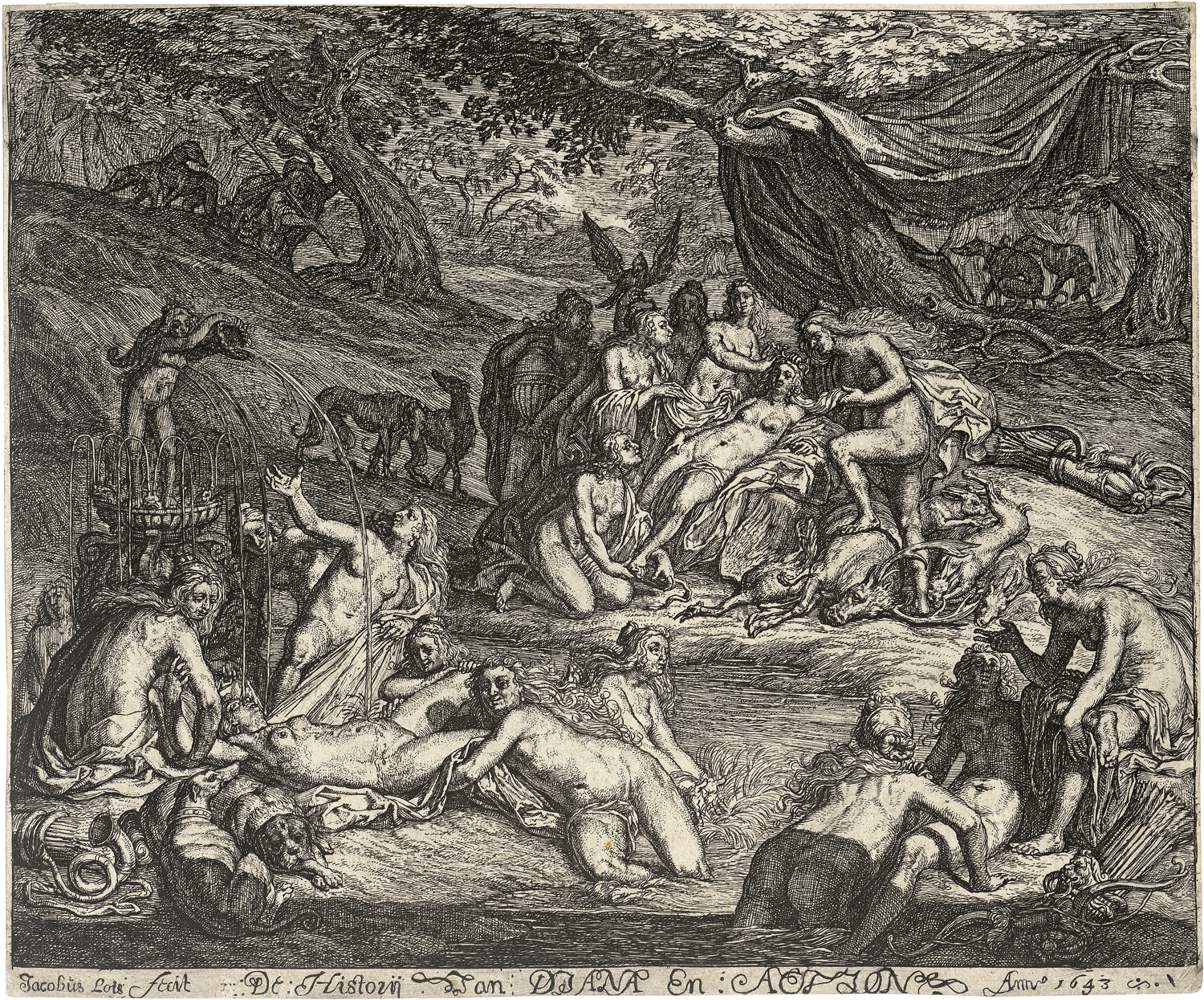 Diana und Actäon. Radierung. 20,2 x 24,3 cm. 1643. Wurzbach 1, Hollstein 1. Wz. Bekröntes Lilienwappen.