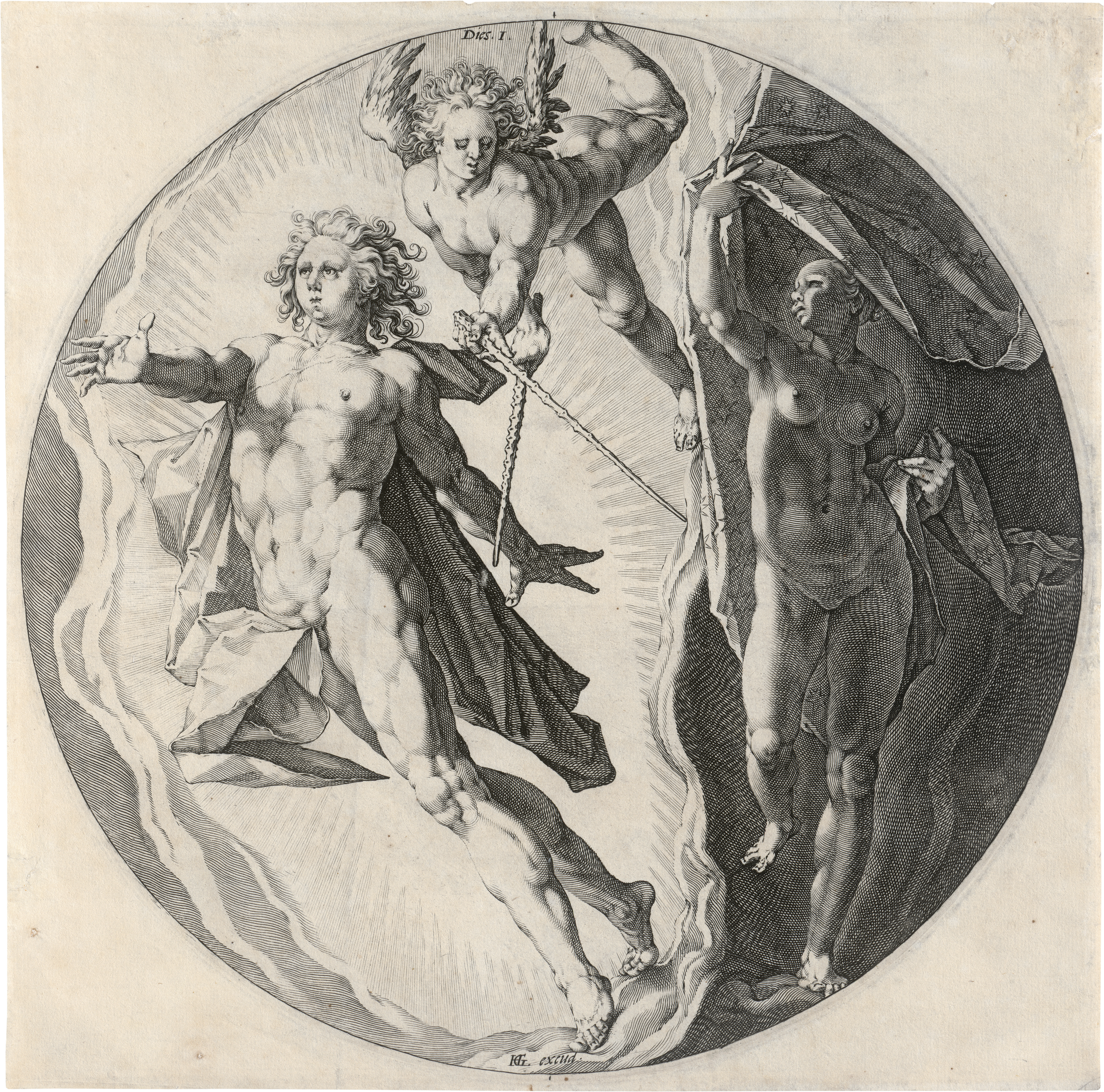 Dies I - Der erste Tag: Die Erschaffung von Licht und Finsternis. Kupferstich im Rund nach Hendrick Goltzius. D. 26,8 cm. (1590). B. 36, Hollstein (Goltzius) 2, Hollstein (Muller) 2, Filedt Kok (New Hollstein, Muller) 36 II. Wz. Lilien über Initialen.
