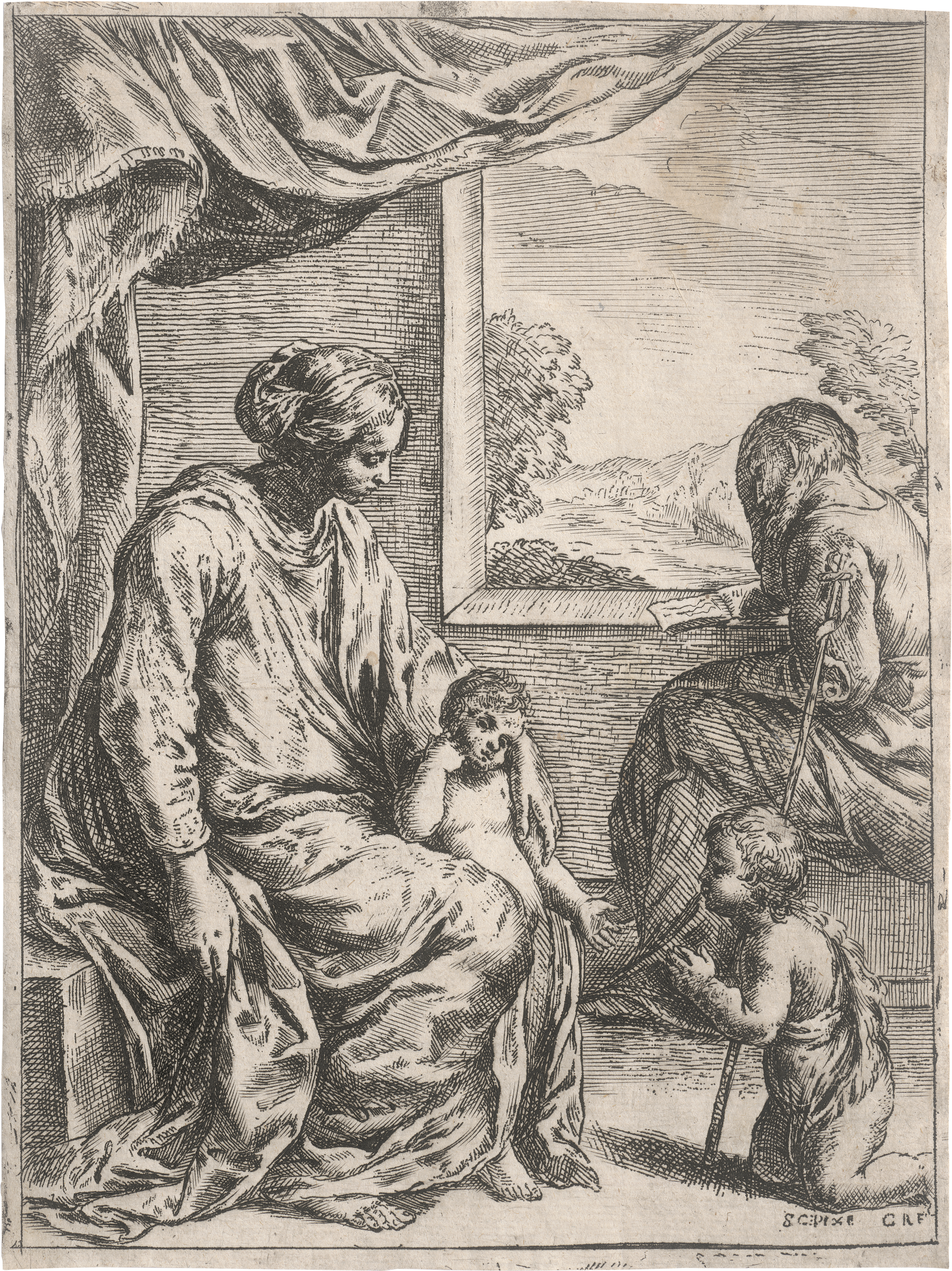 Die Hl. Familie mit dem Johannesknaben. Radierung nach Simone Cantarini. 25,2 x 18,8 cm. Nagler, Die Monogrammisten II, 630; IV, 3999, De Vesme (Pièce douteuse) 1.