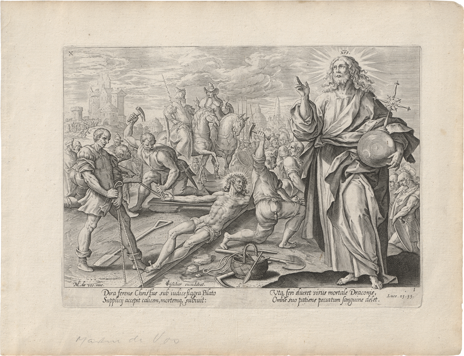 nach. Christus, hl. Paulus und die Martyrien der zwölf Apostel. 13 Kupferstiche von Hendrick Goltzius, Hans Collaert I und anderen. Je ca. 20,7 x 28,5 cm. Hollstein (Vos) 804-816 jeweils letzter Zustand, Leesberg (New Hollstein, Goltzius) 366 und 367, je III, Diels/Leesberg (New Hollstein, Collaert Dynasty) 685-688, je III. Wz. Kleines Wäppchen.