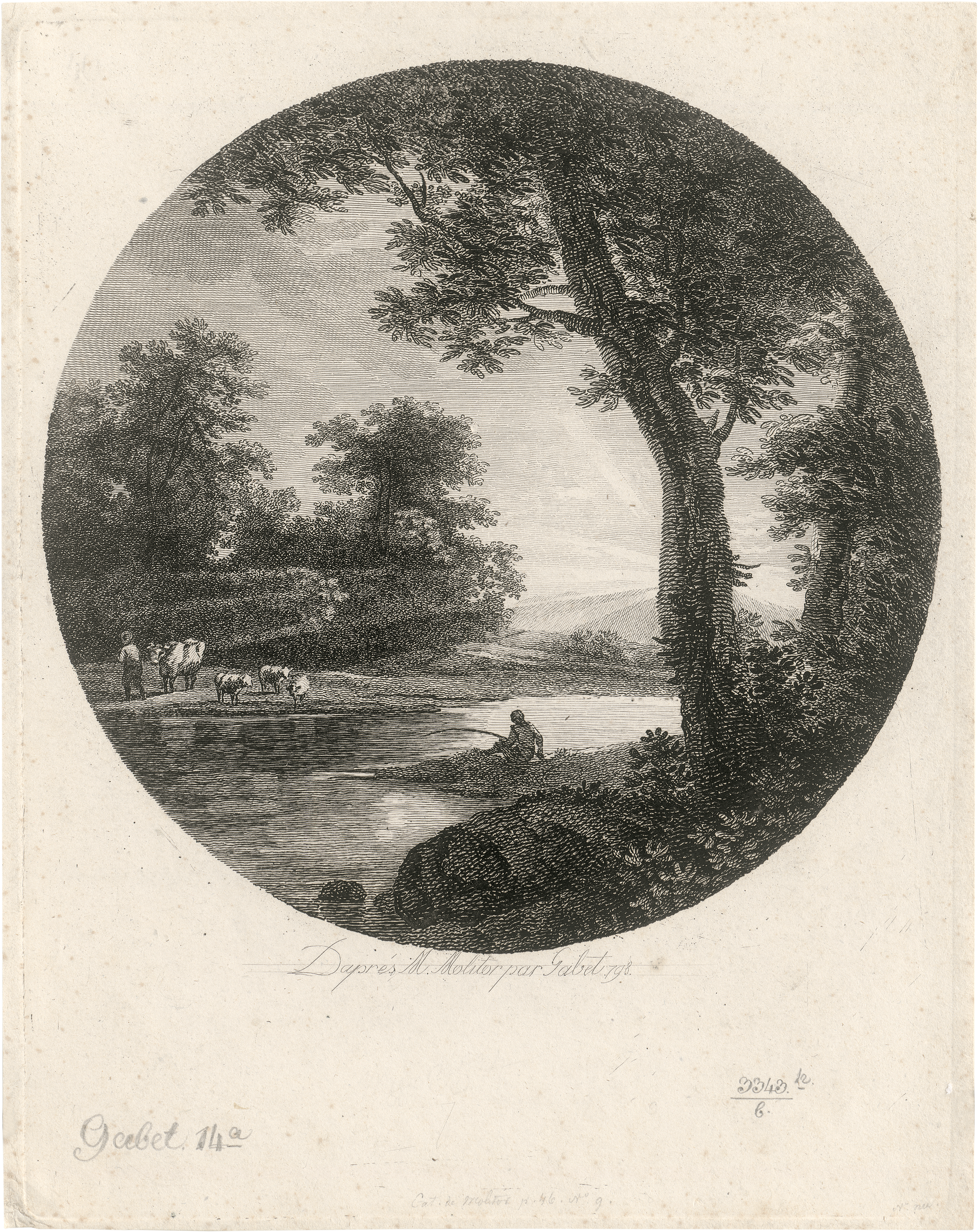 Der Wiener Sammler und dilettierende Künstler Franz Gabet schuf an die einhundert Landschaftsradierungen, deren subtile Technik nur selten den "Dilettanten" verrät. Seine besten Arbeiten entstanden in der Zeitspanne zwischen 1790-1810, darunter eine größere Gruppe von Radierungen nach Martin von Molitor, mit dem Gabet freundschaftlich eng verbunden war und dessen Werke er sammelte. Zu den Blättern nach dem Künstlerfreund Molitor zählen Landschaftsradierungen in runder Form - Nagler erwähnt neun runde Landschaften, Andresen eine sechsblättrige Folge. Die beiden vorliegenden Blätter mit der einheitlichen Beschriftung "D'aprés M. Molitor par Gabet 798" weisen ein größeres Format auf als die anderen Landschaftstondi Gabets und entstanden offensichtlich als Pendants (vgl. Albertina, Klebebände, Nr. D/III/45/39 und D/III/45/40). Der kompositorisch gespiegelte Bildaufbau verschränkt die beiden Teile eines einheitlichen, mittig geteilten Landschaftsmotivs. - Prachtvolle Drucke mit schmalen Rändern um die Plattenkanten, leicht stockfleckig, an den linken Ecken verso Reste alter Montierung, sonst sehr schön erhalten. Aus der Sammlung Johann Nepumuk Seiler, München (Lugt 3976). Selten.