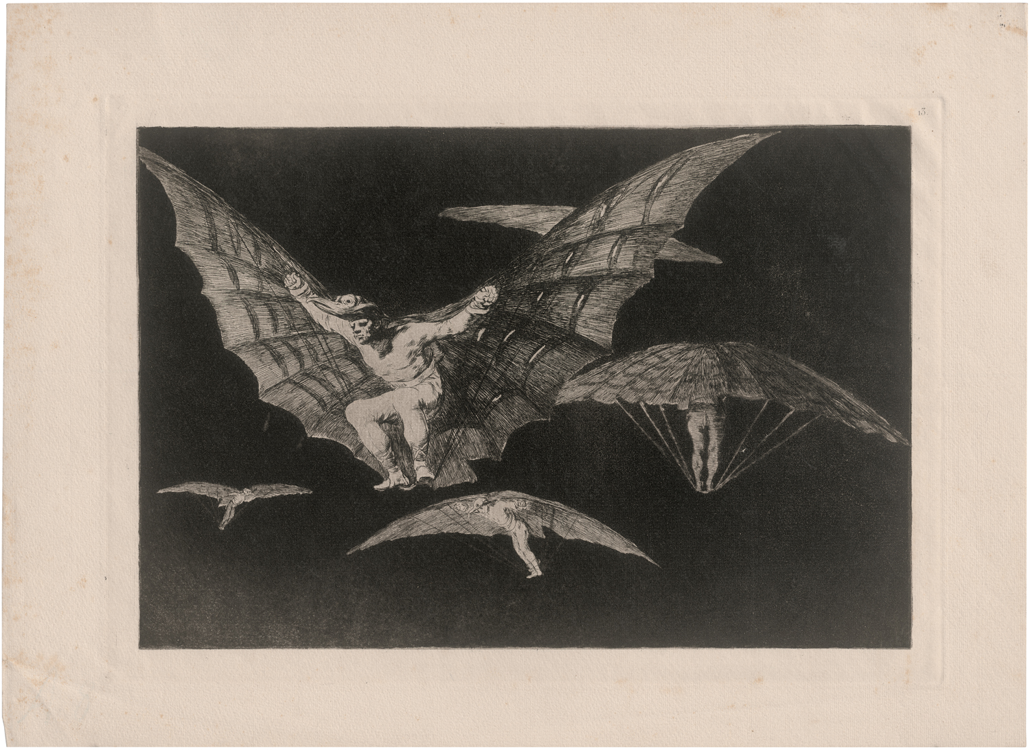 Modo de volar - donde hay ganas hay mana. Radierung mit Aquatinta auf Bütten, aus der Folge Los Proverbios, wie auch die folgenden vier Losnummern. 24,4 x 35 cm (Plattenrand); 31,1 x 42,7 cm (Blattgröße). Delteil 214, Harris 260 III, wohl 5. Ausgabe (von 9).