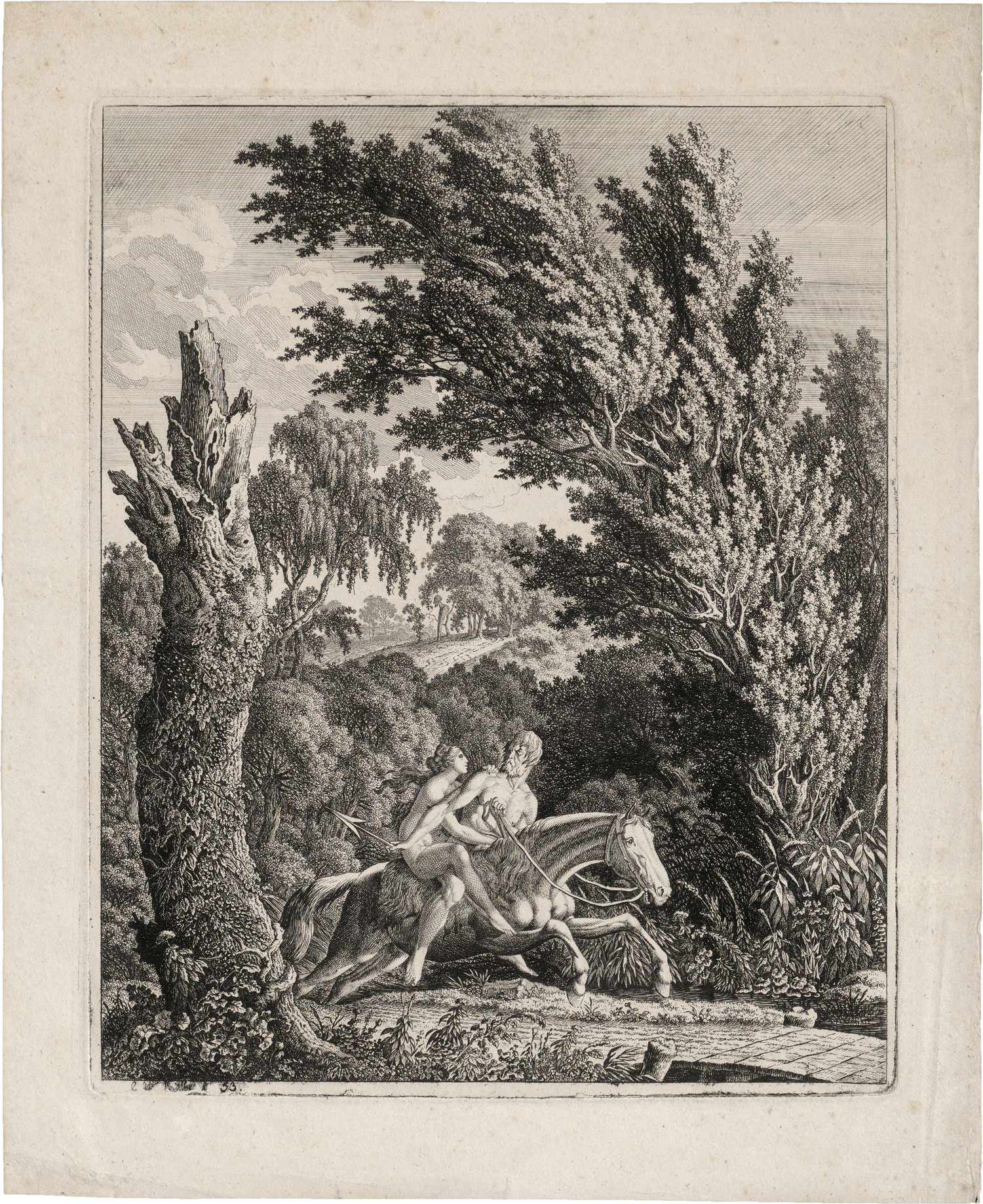 Ein Reiter mit Lanze springt nach rechts über einen Steg. Radierung auf Velin. 36 x 29,1 cm. Jentsch 51, Martens 173 II (von III).
