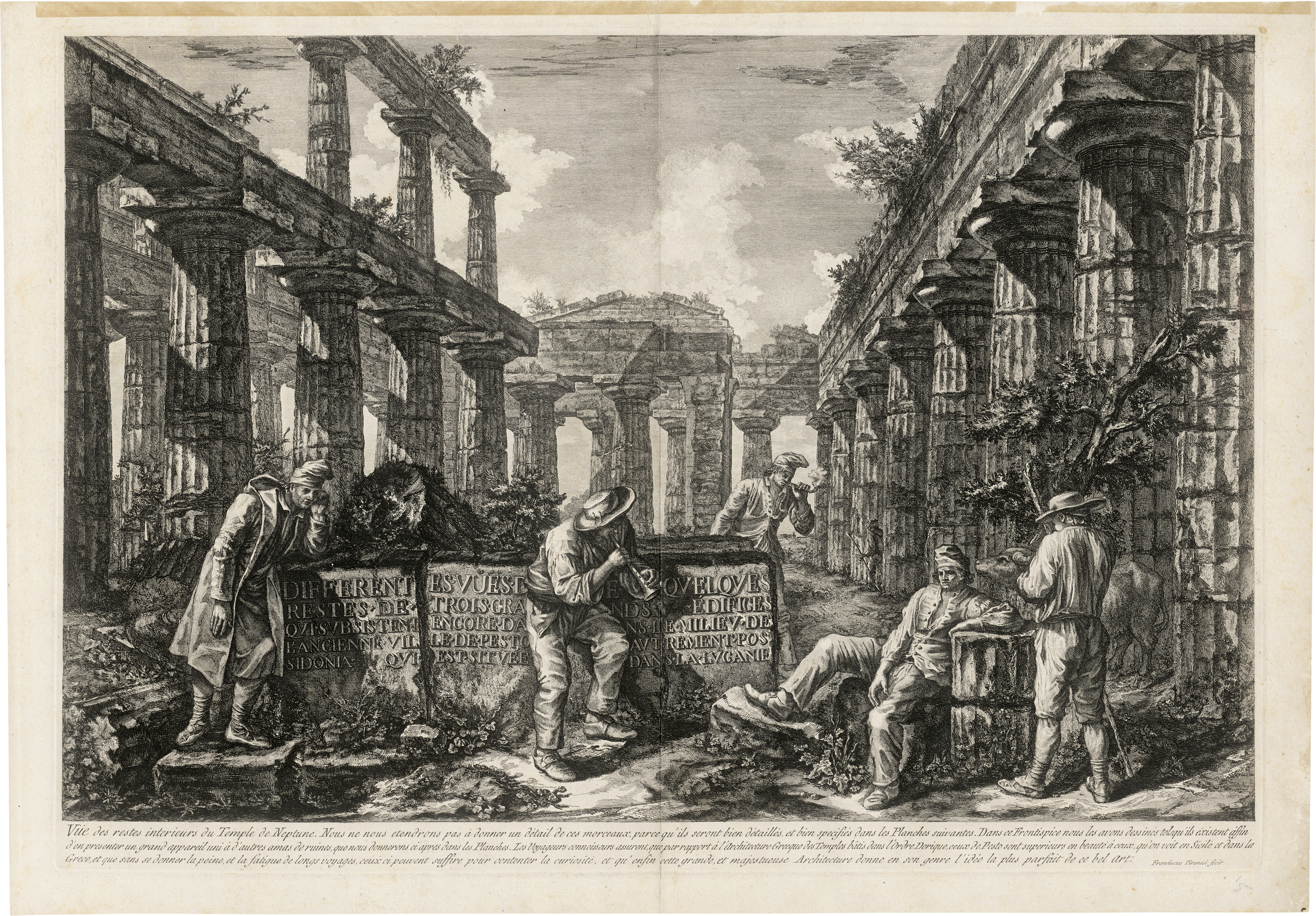 Piranesis letzte Arbeit, die sogenannte Paestum-Folge zählt zu seinen bedeutendsten und klarsten architektonischen Darstellungen und hatte zugleich einen nicht zu unterschätzenden Einfluss auf die Wertschätzung der eigenständigen Schönheit der griechischen Antike in der neoklassizistischen Architektur. Piranesi waren die drei Tempel aus dem 5. Jahrhundert lange bekannt, doch reiste er erst in den Jahren 1777 und 1778 dorthin und fertigte vor Ort zahlreiche Studien an. Er wurde dabei sowohl von seinem Sohn Francesco, als auch von seinem Assistenten Benedetto Mori und dem Architekten Augusto Rosa begleitet. Die aus diesen Vorstudien entstandene Folge erschien schließlich am 15. September 1778, nur zwei Monate vor Piranesis Tod und bildet einen späten Höhepunkt in seinem Schaffen. Einige Autoren nehmen an, dass die Ausführung der Stiche, zumindest in Teilen, von seinem Sohn Francesco und der Werkstatt unterstützt wurde. So wird für die drei letzten Platten - das Frontispiz und die Blätter XIX und XX - davon ausgegangen, dass Francesco sie ausgeführt hat; dessen Stil ist in der Ausführung der Staffage durchaus erkennbar (vgl. dazu Wilton-Ely S.777 f). Vor den arabischen Nummern. Ganz ausgezeichnete bis prachtvolle Drucke mit schmalem, teils mit feinem Rand, einzelne Blätter an die Plattenkante geschnitten, diese bei allen Blättern überwiegend markant zeichnend. Vertikale Mittelfalz, dort bei einem Blatt unten gesprungen, vornehmlich in den Rändern stockfleckig und fleckig, links alte Heftspuren der Albummontierung, oben entlang des äußeren Randes alte Klebespuren recto, diese etwas braunfleckig, weitere Alters- und Gebrauchsspuren, sonst in sehr guter und einheitlicher Erhaltung.