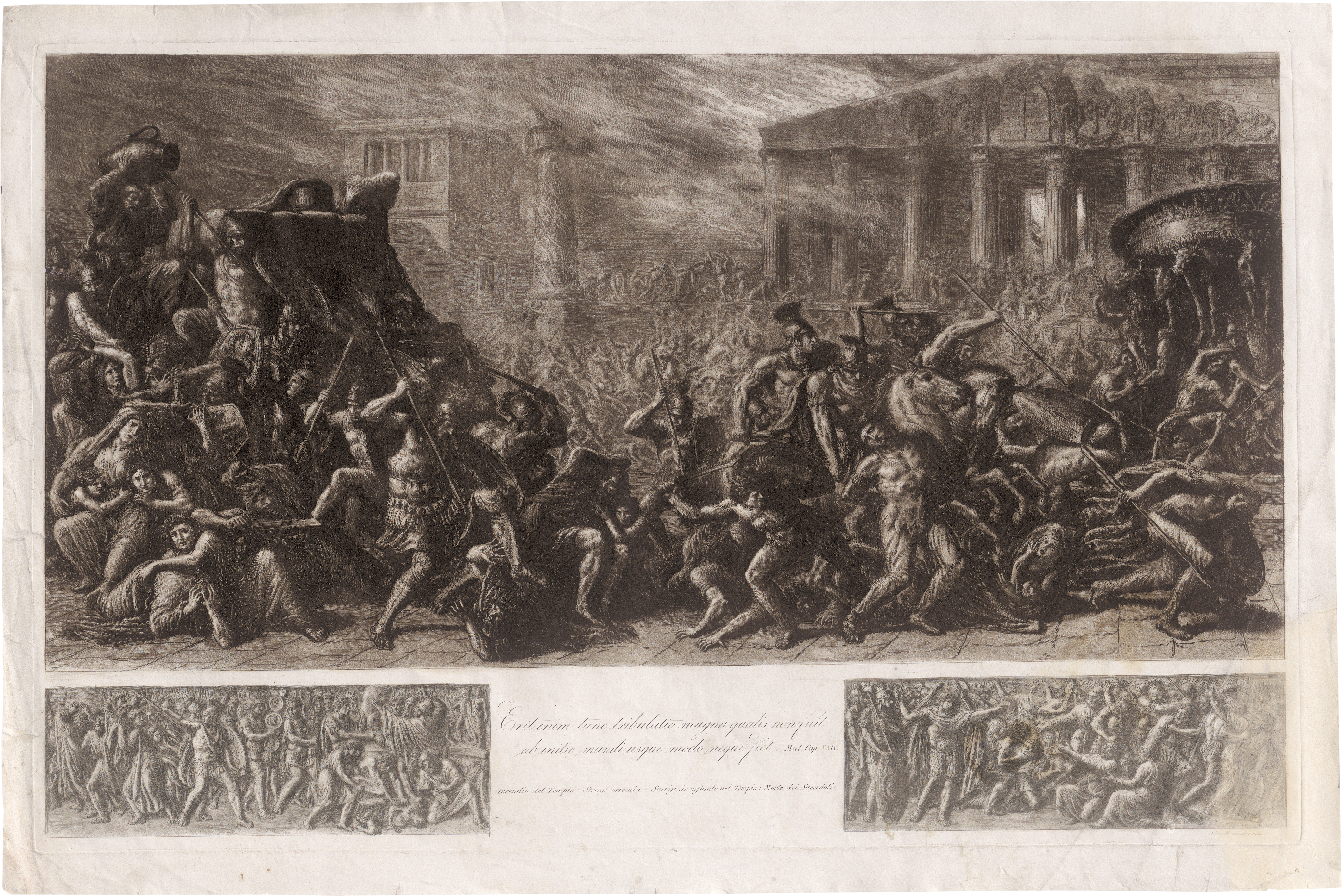 Ademollos imposantes druckgraphisches Werk entstand im Zeitraum 1794 und 1837. Die sechs Szenen illustrieren Episoden aus der Einnahme und Zerstörung Jerusalems durch die Römer, jeweils mit zwei kleinen ergänzenden Szenen unten und Zitaten aus den Evangelien Lucas und Matthäus: Das römische Heer vor den Mauern Jerusalems „Cum autem videritis circumdari…“; Jerusalem von den Römern eingeschlossen, „Et circundabunt…“; Der Brand des Tempels in Jerusalem, „Erit enim tunc tribulatio…“; Der Wiederaufbau des Tempels wird durch Erdbeben und Feuer verhindert, „Haec quae videtis…“; Titus belohnt die Soldaten nach der Zerstörung Jerusalems, „ Et ad terram prosternent…“; Der Triumph des Titus, „Et cadent in ore gladii…“. Ganz ausgezeichnete, gegensatzreiche Drucke mit schmalem Rand. Teils etwas fleckig und faltig, leichte altersbedingte Gebrausspuren und Erhaltungsmängel, der Gesamteindruck jedoch gut. Selten.