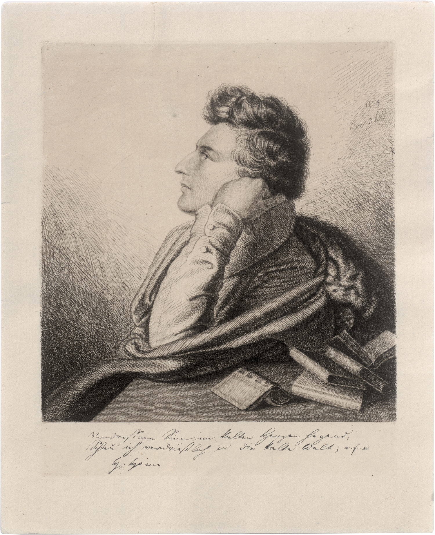 Heinrich Heine, der Grimm im November 1827 besucht hatte, fügte der Radierung eine eigenhändige Verszeile auf der Druckplatte hinzu: „Verdrossnen Sinn im kalten Herzen hegend, / Schau' ich verdrießlich in die kalte Welt […].“ (Anfang eines Gedichts, das später im Jahre 1832 im "Neuen Frühling" als Gedicht Nr. 42 erschien). Anlass für die Zeilen war eine verregnete Reise Heines über über Kassel nach München zu Redegierung der Politischen Annalen bei Cotta. Das schlechte Wetter ließ Heine bei "übler Laune" in Kassel ankommen. Heine hatte Grimm schon im Jahre 1825 erstmals besucht, als Ludwig seinem Bruder Ferdinand berichtete: "Ein Dichter, Heinrich Heine, hat mich von Göttingen aus, wo er Jura studiert, besucht: Er hat ein gescheites Gesicht und ist auch nicht häßlich und auch just nicht unangenehm. Er schwätzt nur gar zu viel und über alles, was ihm vorkommt. Er hinkte an einem Fuß, wie er bei mir war, und sagte, er habe die größten Schmerzen; es soll, wie er sagte, ihn der Kutscher umgeworfen haben. Es scheint mir aber nicht wahr zu sein." Im Jahre 1827 besuchte Heine ihn dann zwei weitere Male und bei seinem letzten Besuch saß er Grimm nun auch Modell. Grimm schrieb zu der Begegnung: "Eben war der Dichter Heine bei mir, kommt aus England und Holland, hat dort viel gesehen, interessante Bemerkungen gemacht und ist ein geistreicher Mensch; heute Mittag will er wieder zu mir kommen." (vgl. Stoll S. 389f). - Ausgezeichneter Druck mit schönem Plattenton und Rand. Oben ein geschlossener Randeinriss bis an die Plattenkante, links drei kleine Randeinrisse im weißen Rand, sonst sehr gut erhalten. Selten.