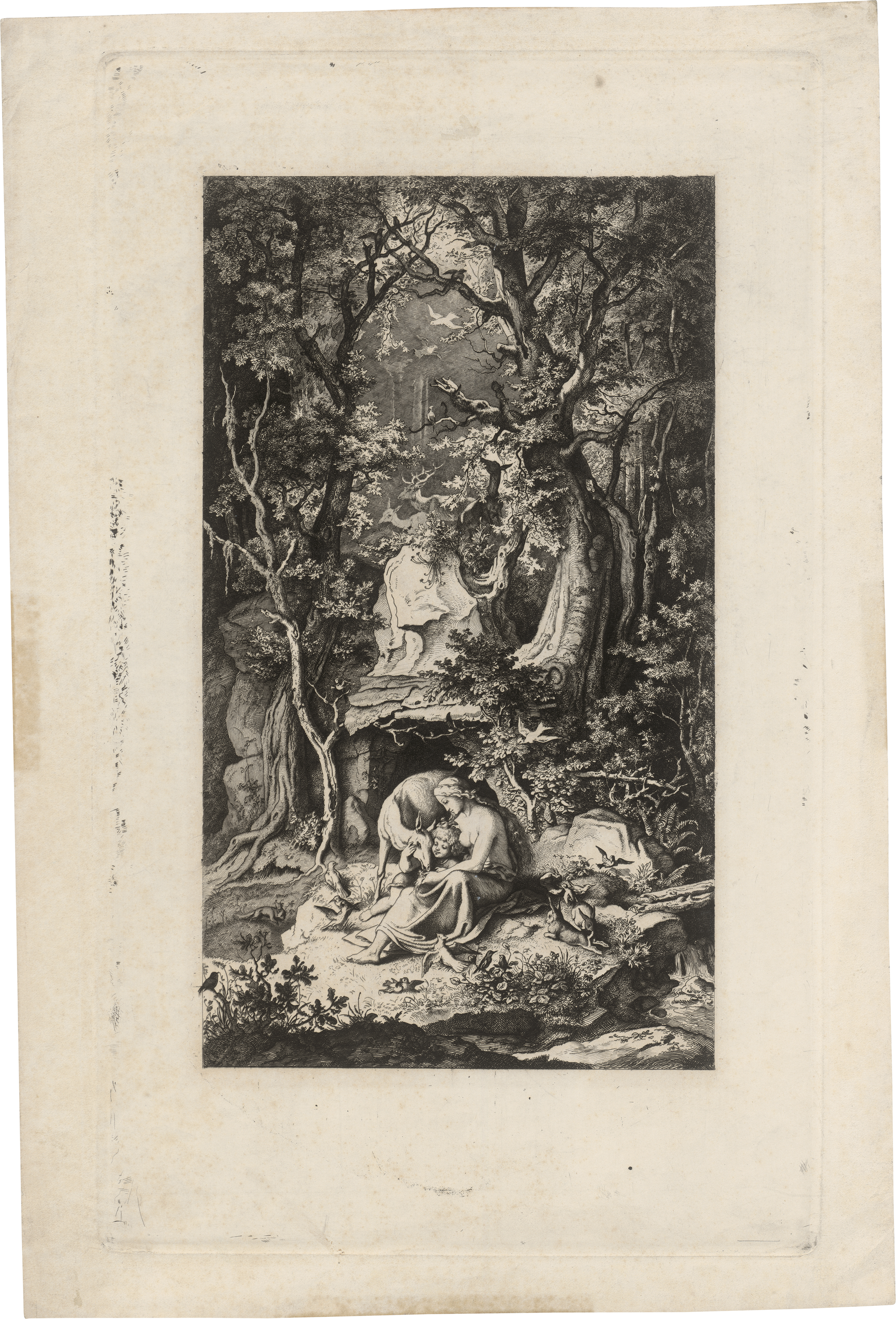 Dies ist eines der Hauptblätter Richters, das zusammen mit seinem Pendant "Rübezahl" 1847 vom Sächsischen Kunstverein in Auftrag gegeben wurde. Richters Sohn Heinrich berichtet: "An demselben Tage, an welchem in Dresden der blutige Maiaufstand von 1848 ausbrach, Trommeln in den Straßen rasselten und Barrikaden gebaut wurden, stand Richter im Hauspelz vor seinem Arbeitstisch, ätzte die Platten seiner friedlichen Idyllen und ließ sich in dieser delicaten Arbeit nicht stören" (Hoffmann, S. 10). - Prachtvoller, differenzierter und dabei unvollendeter Probeabzug mit breitem Rand. Vor weiteren Arbeiten wie den Schraffuren, Schatten und dem dichteren Gras um Genovevas Fuß, mit zahlreichen Nadelproben im breiten Plattenrand, vor der späteren Schrift und allen Einfassungslinien. Im weißen Rand leicht fleckig, verso schwach stockfleckig, weitere geringe Gebrauchsspuren, sonst in ganz vorzüglicher Erhaltung. Von großer Seltenheit.