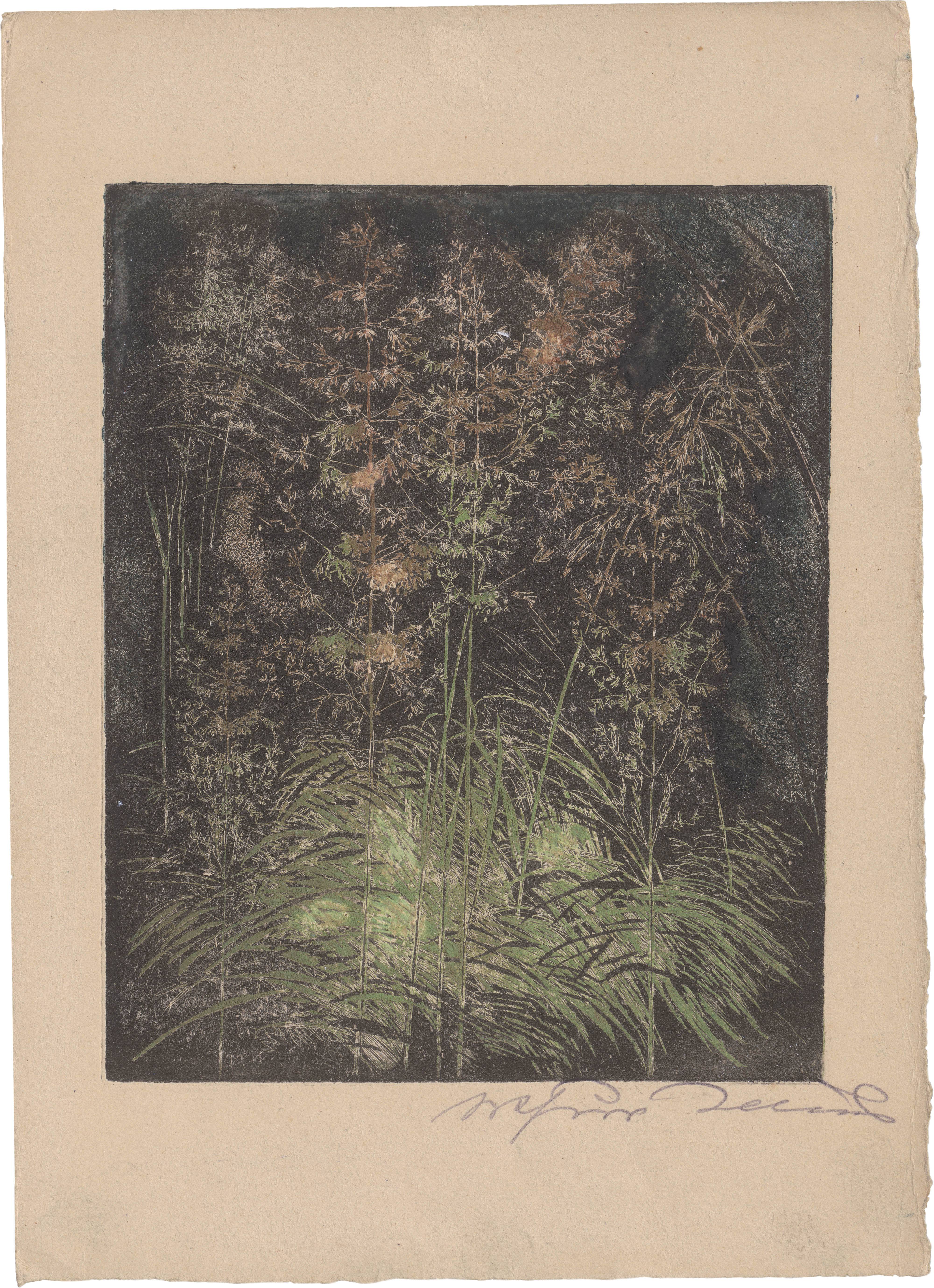 Blühendes Gras. Farbradierung und Hochätzung auf chamoisfarbenem Kupferdruckpapier. 24,5 x 19,7 cm. Signiert. Graphikwerkverzeichnis (online) 318.