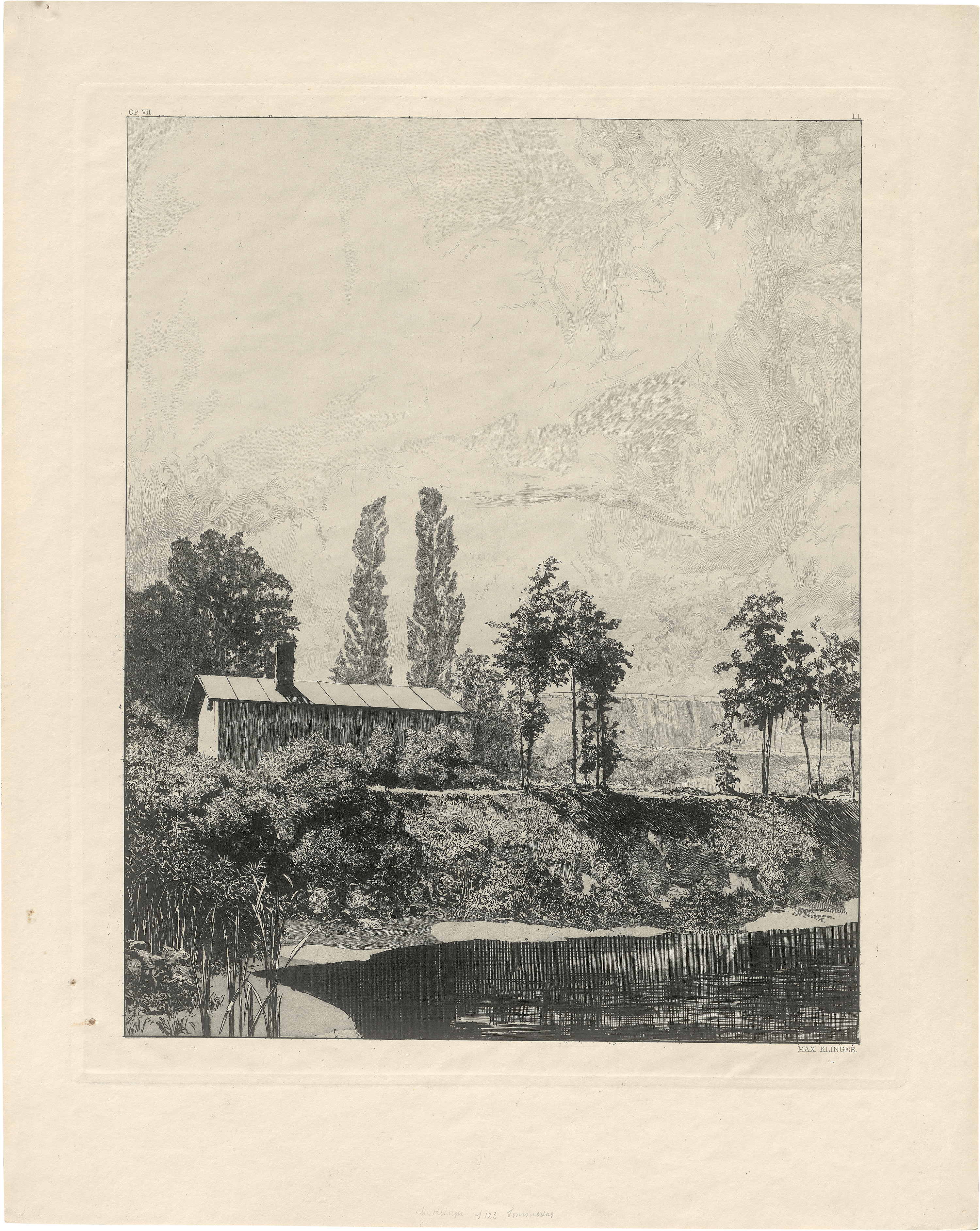 Blatt 1 der Folge "Vier Landschaften" (Opus VII). Prachtvoller, gratiger Druck mit Rand. Im linken Rand außerhalb der Einfassung und im weißen Rand kl. bräunliche Fleckchen und Druckspuren, leicht angestaubt, sonst gut. Beigegeben aus derselben Folge von Max Klinger "Mondnacht" (Singer 125 IV).