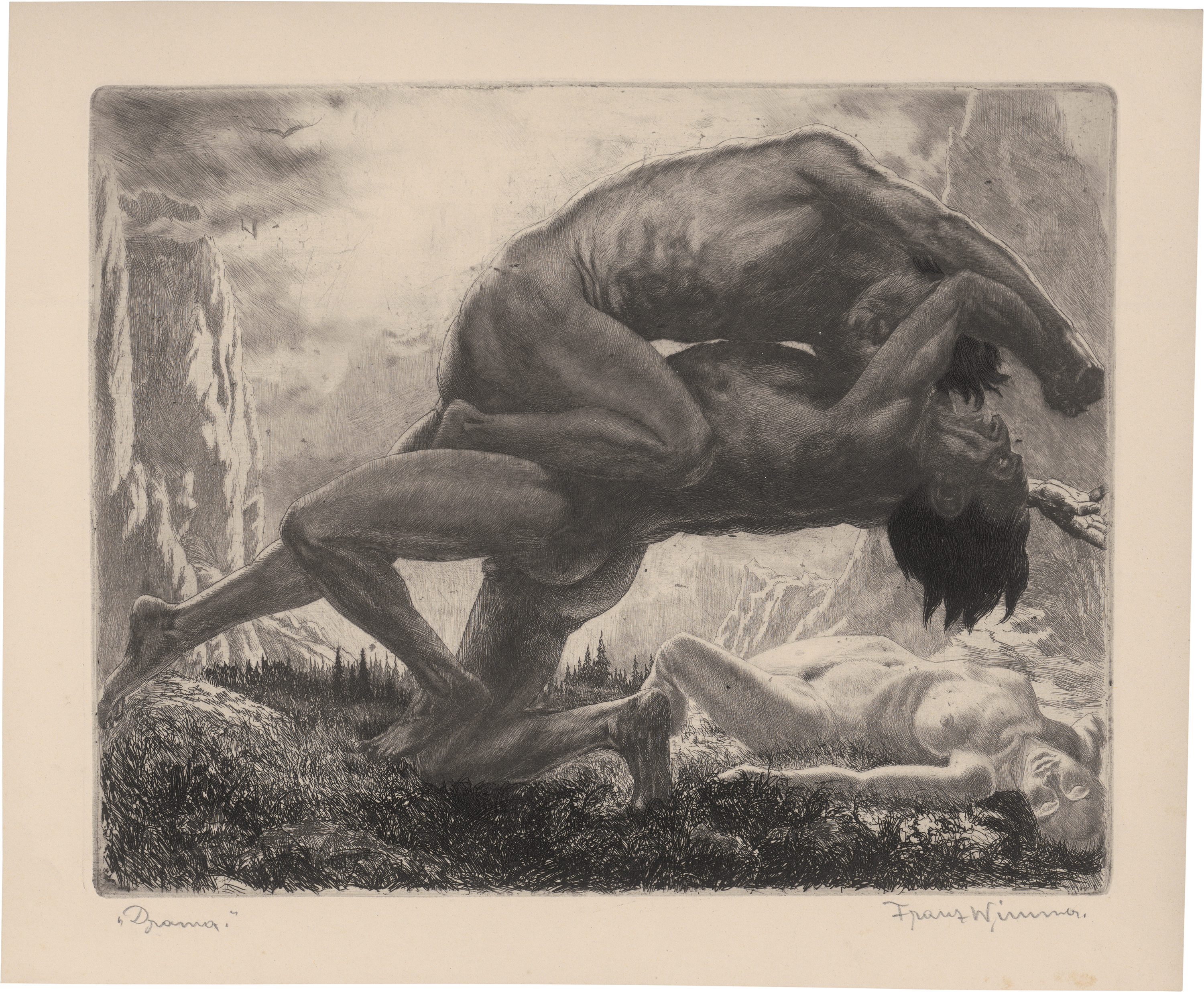"Drama" (Zwei ringende Männer). Radierung. 24,1 x 30,1 cm. Betitelt und signiert.