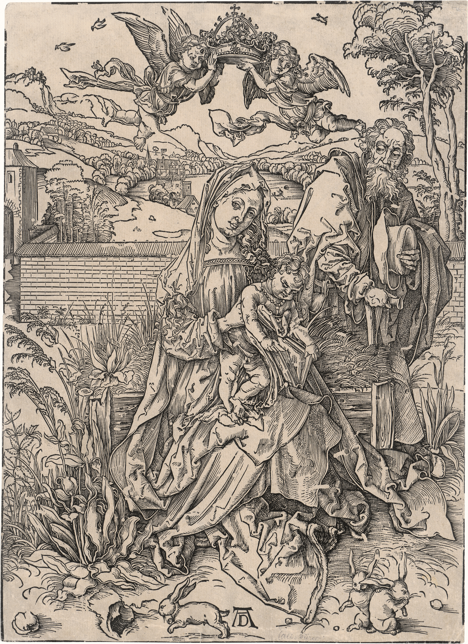 Die Heilige Familie mit den Hasen. Holzschnitt. 39,3 x 28,5 cm. Um 1498. B. 102, Meder 212 i.