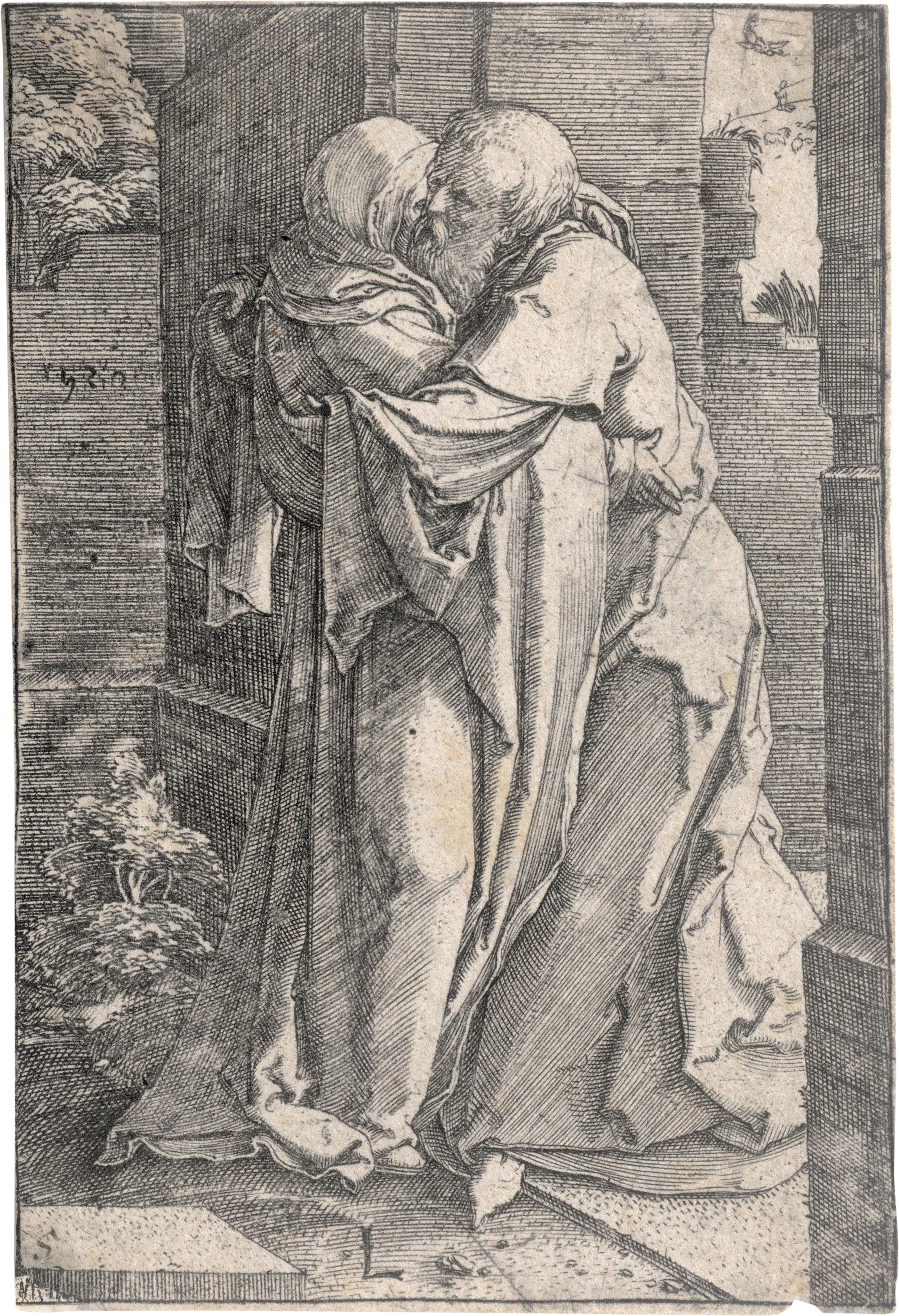 Joachim und Anna unter der Goldenen Pforte. Kupferstich. 10,7 x 7,2 cm. 1520. B. 34, Hollstein 34, Filedt Kok (New Hollstein) 34 b.