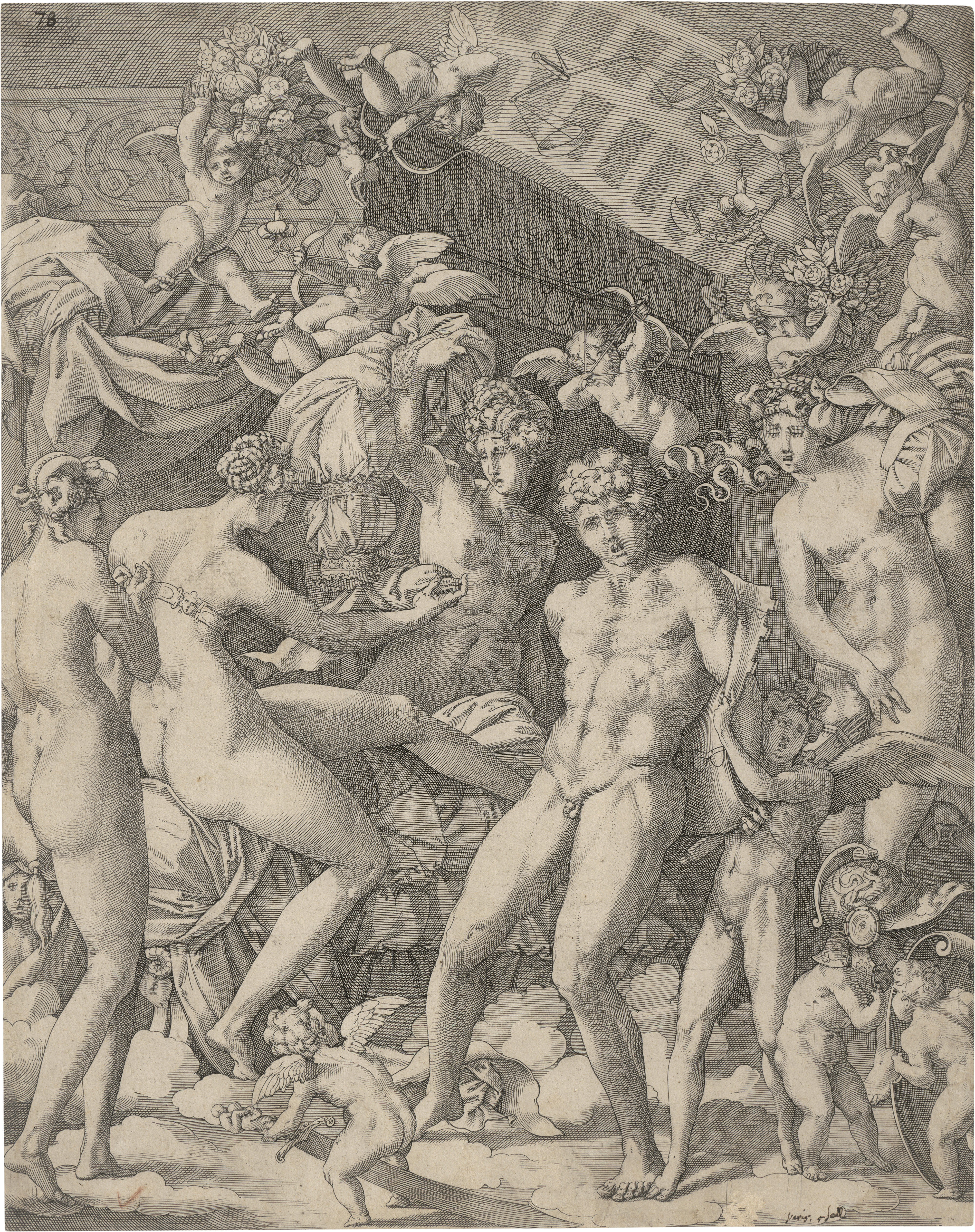 Das Monogramm HCB wurde lange Zeit mit dem deutschen Kupferstecher Binck identifiziert. Inzwischen gilt jedoch als gesichert, dass es sich um einen eigenständigen italienischen Stecher handelt, der dieses Monogramm verwendete und in den 1560er-Jahren tätig war. Die Platte wird daher mit Vorbehalt unter seinem Namen geführt. - Ausgezeichneter Druck auf die Darstellung beschnitten. Vereinzelt fleckig, links kleiner horizontaler Randeinriss, darüber schwache horizontale Quetschfalte, am Unterrand kleine oberflächliche Bereibungen, oben und unten Federannotationen, aufgezogen, sonst schön.