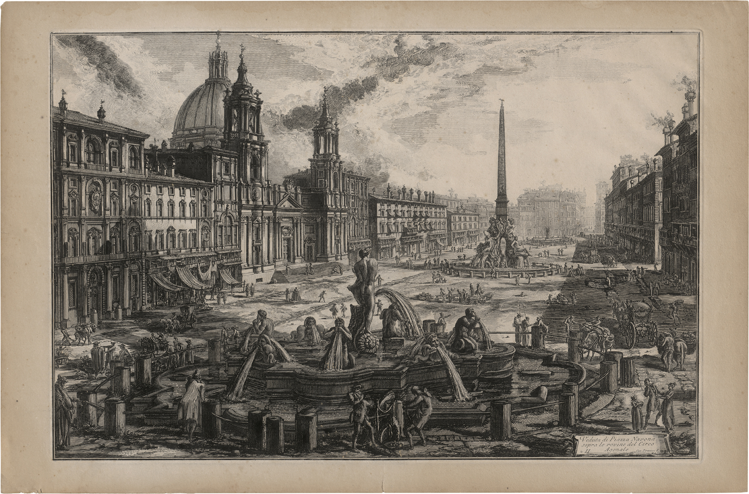Veduta di Piazza Navona sopra le rovine del Circo Agonale, mit Sant' Agnese zur Linken. Radierung. 47 x 70,5 cm. (1773). Hind 108 II (von IV).
