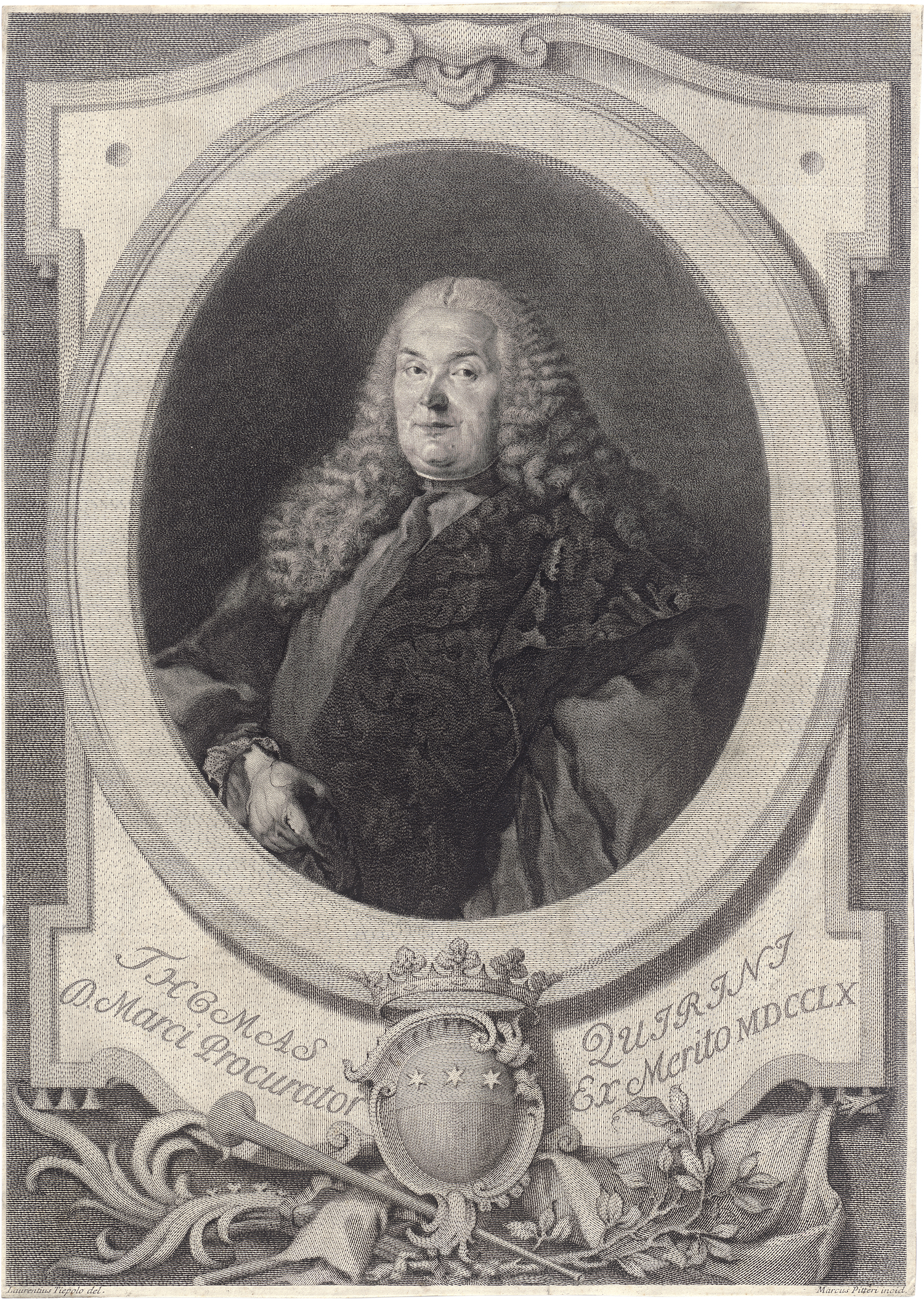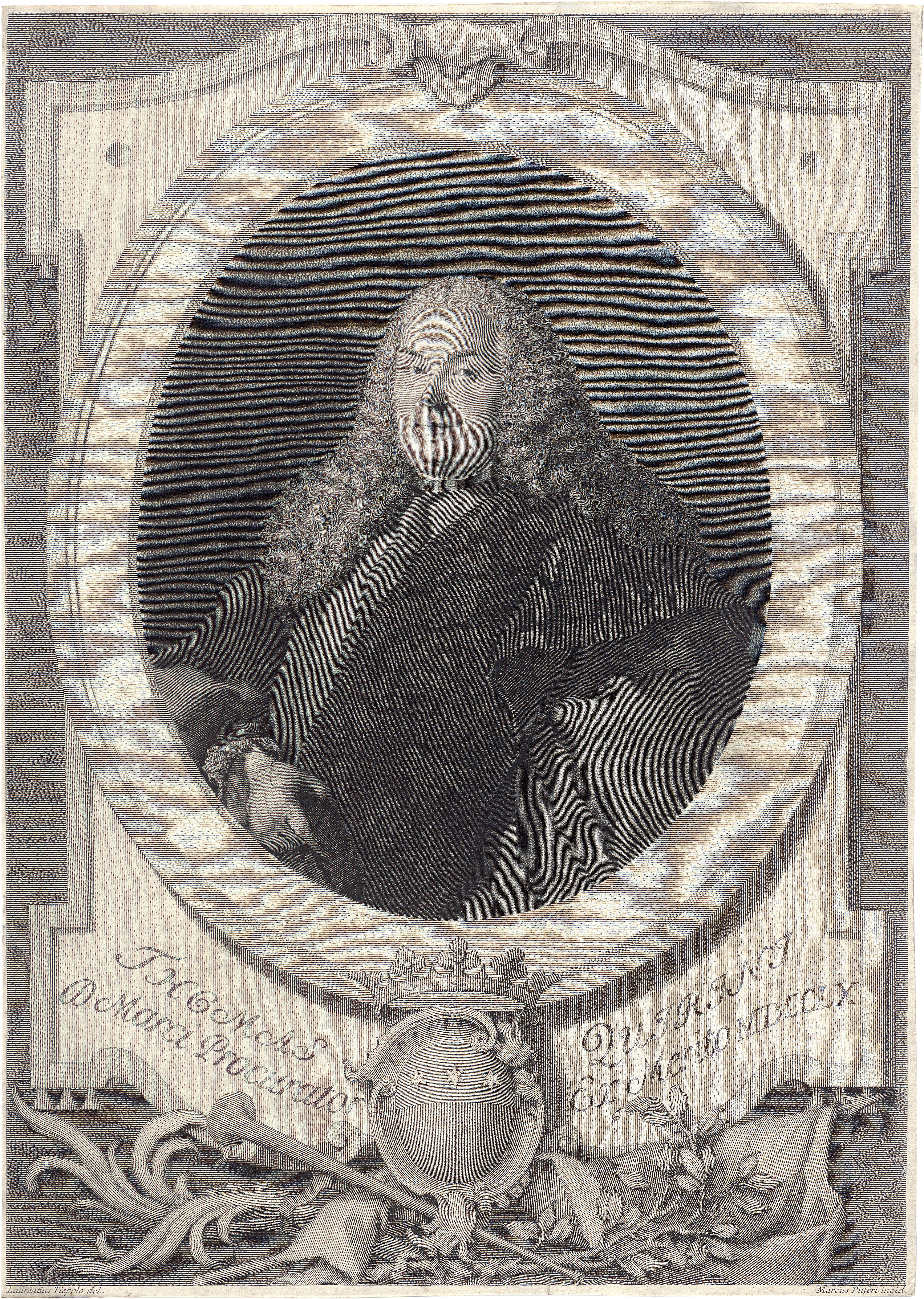Bildnis Thomas Quirinis. Radierung nach Lorenzo Tiepolo. 44,5 x 31,6 cm. 1760. Le Blanc 107, Ravà 228. Wz. Lilie zwischen Lettern A und I.