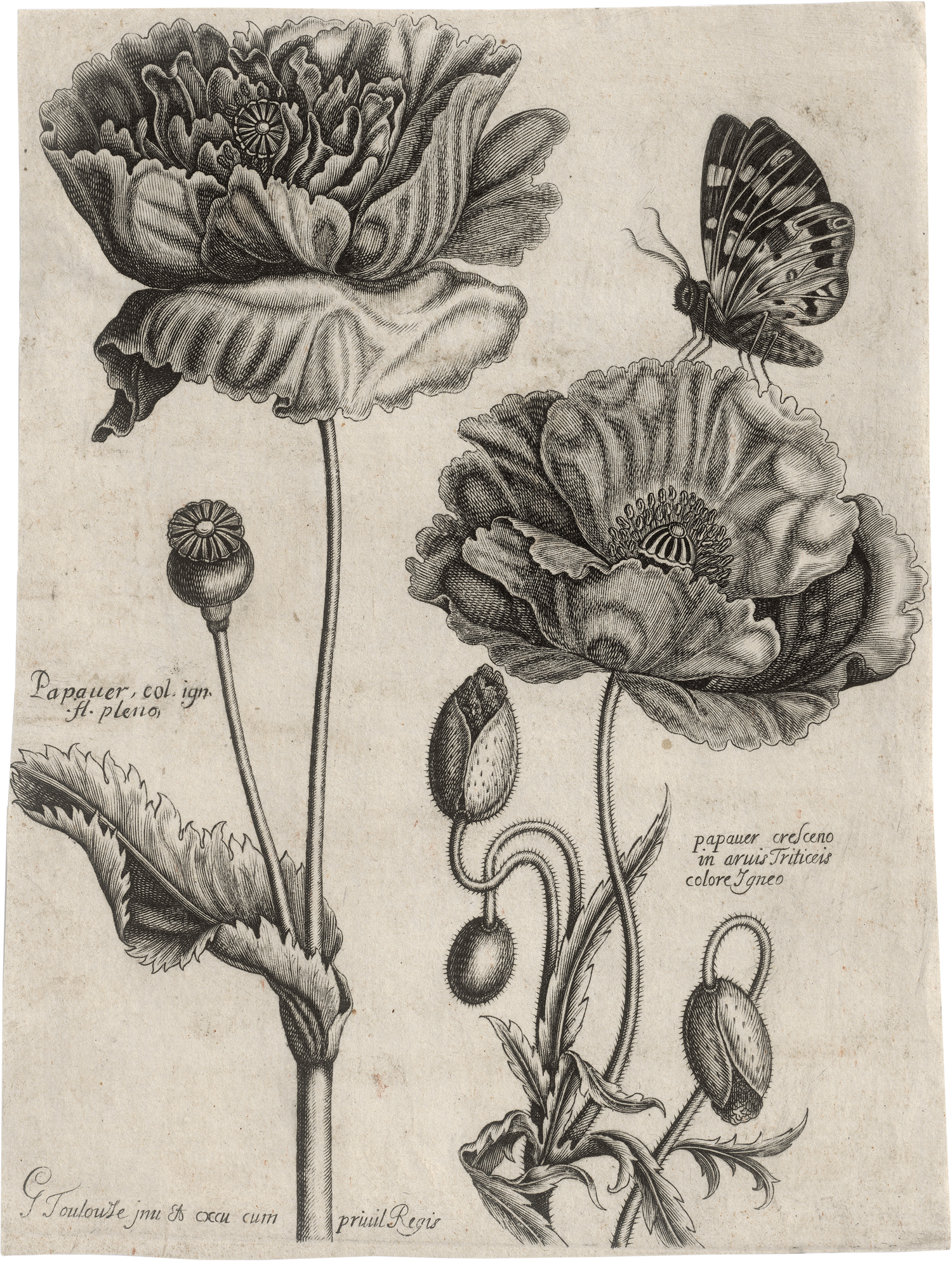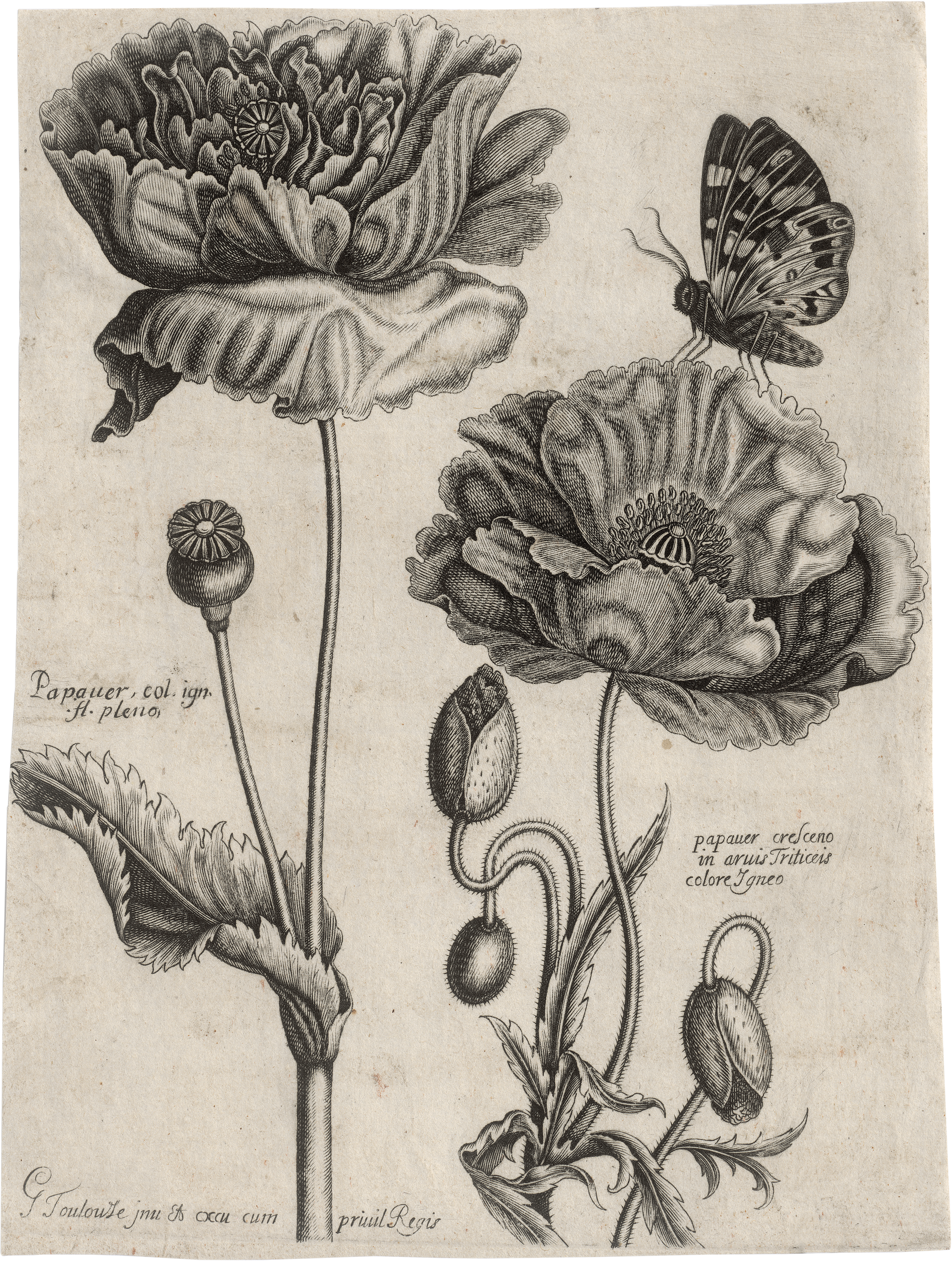 7 Blatt aus dem Livre de Fleurs, Feuilles, et oyzeaus, inventé et dessinné apres le nature. 7 Kupferstiche. 18 x 13,7 cm. (1656). Thieme-Becker, Bd. XXXIII, S. 320. Wz. Wappenschild mit Löwe von Lilienkranz umgeben.