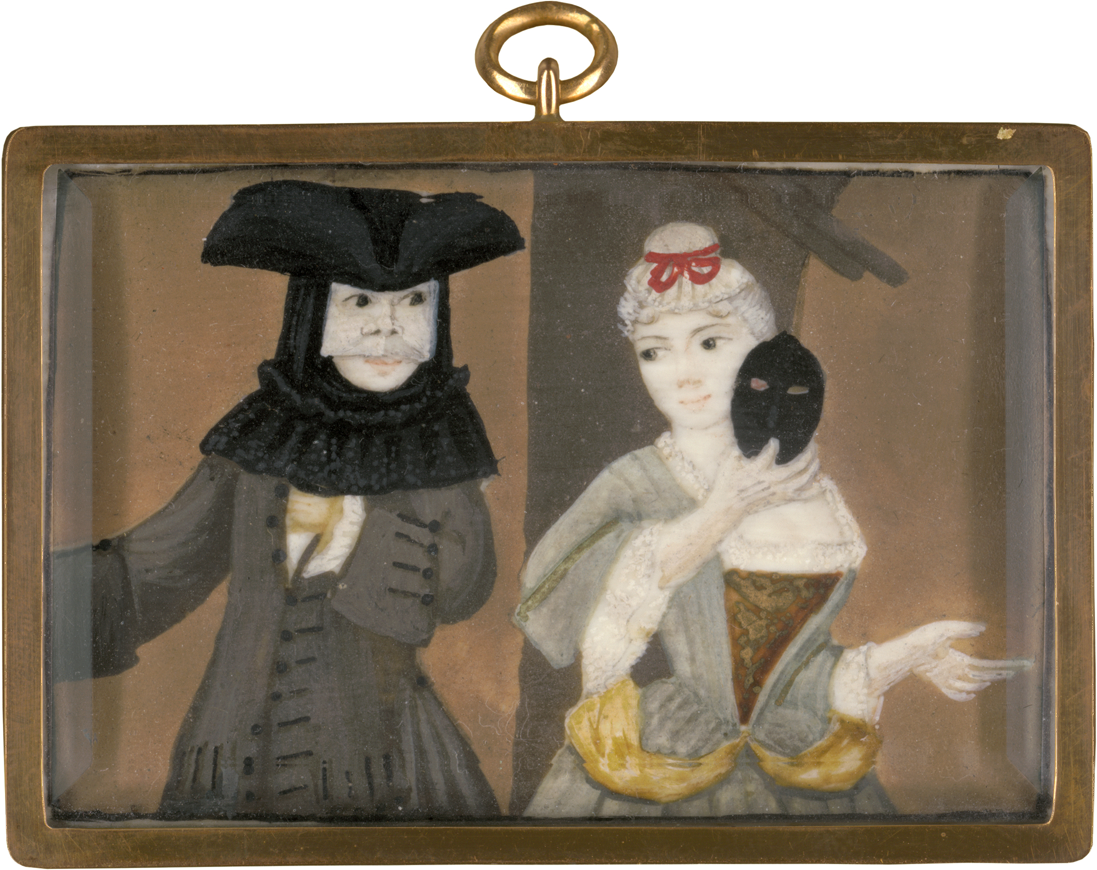um 1740. Szene aus der Commedia dell'Arte; Szene aus dem venezianischen Karneval mit zwei maskierten Figuren.