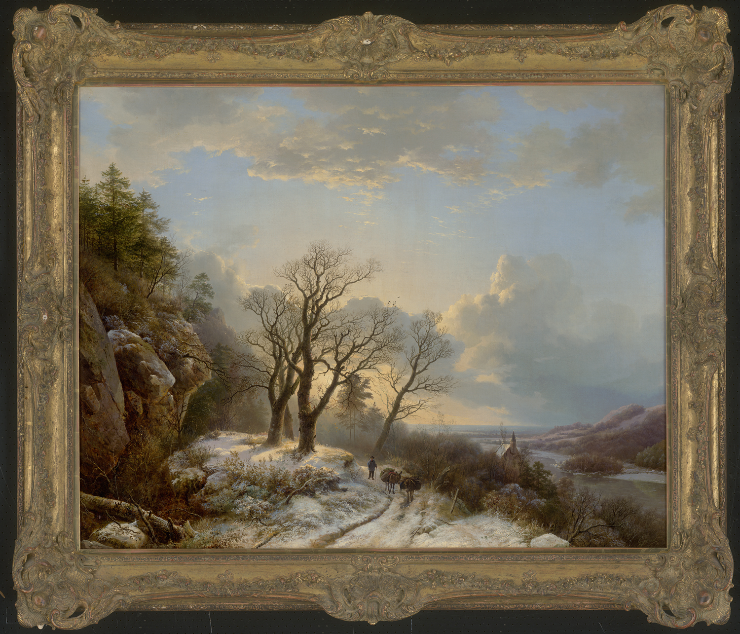 Große Winterlandschaft mit Eseltreiber im Sonnenlicht (Große Winterlandschaft mit Staffage).