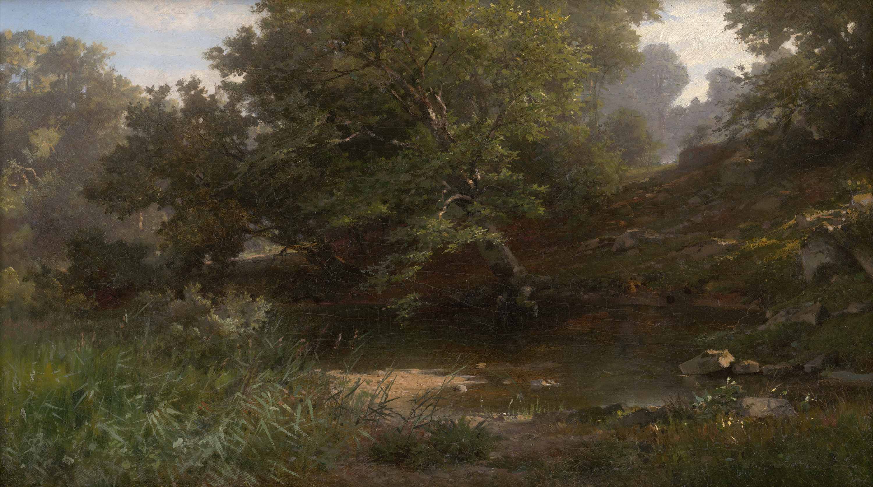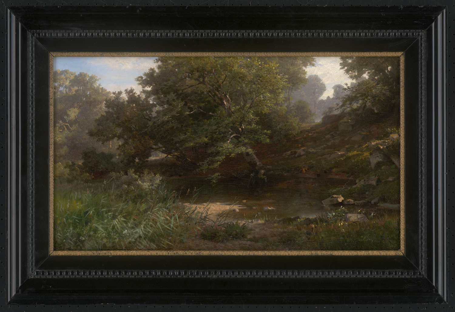 (1820 Koschmin (Kozmin)- 1894 München)Wassertümpel in bewaldeter Hügellandschaft