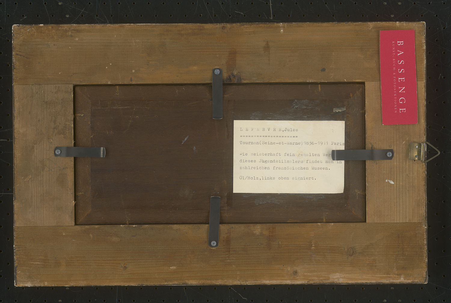Öl auf Holz, an vier Seiten abgefast. 27,3 x 13,1 cm. Oben links signiert "Jules LeFebvre".
