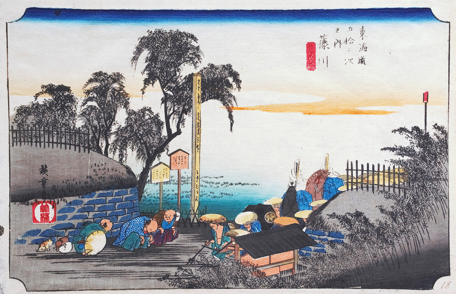 Die Landschaftsdarstellung zeigt Fujikawa, einen Fluss, der von Yamanashi nach Shizuoka fließt. Im Vordergrund verneigen sich Bauern und Dorfbewohner ehrerbietig vor der herannahenden Daimyo-Prozession. Der Himmel, der sich über die Szene spannt, wechselt von einem tiefen Blau zu warmen Orange und geht beinahe nahtlos in den Fluss über. – Im linken weißen Rand mit sehr kleinen Knickspuren, insgesamt in sehr guter Erhaltung.