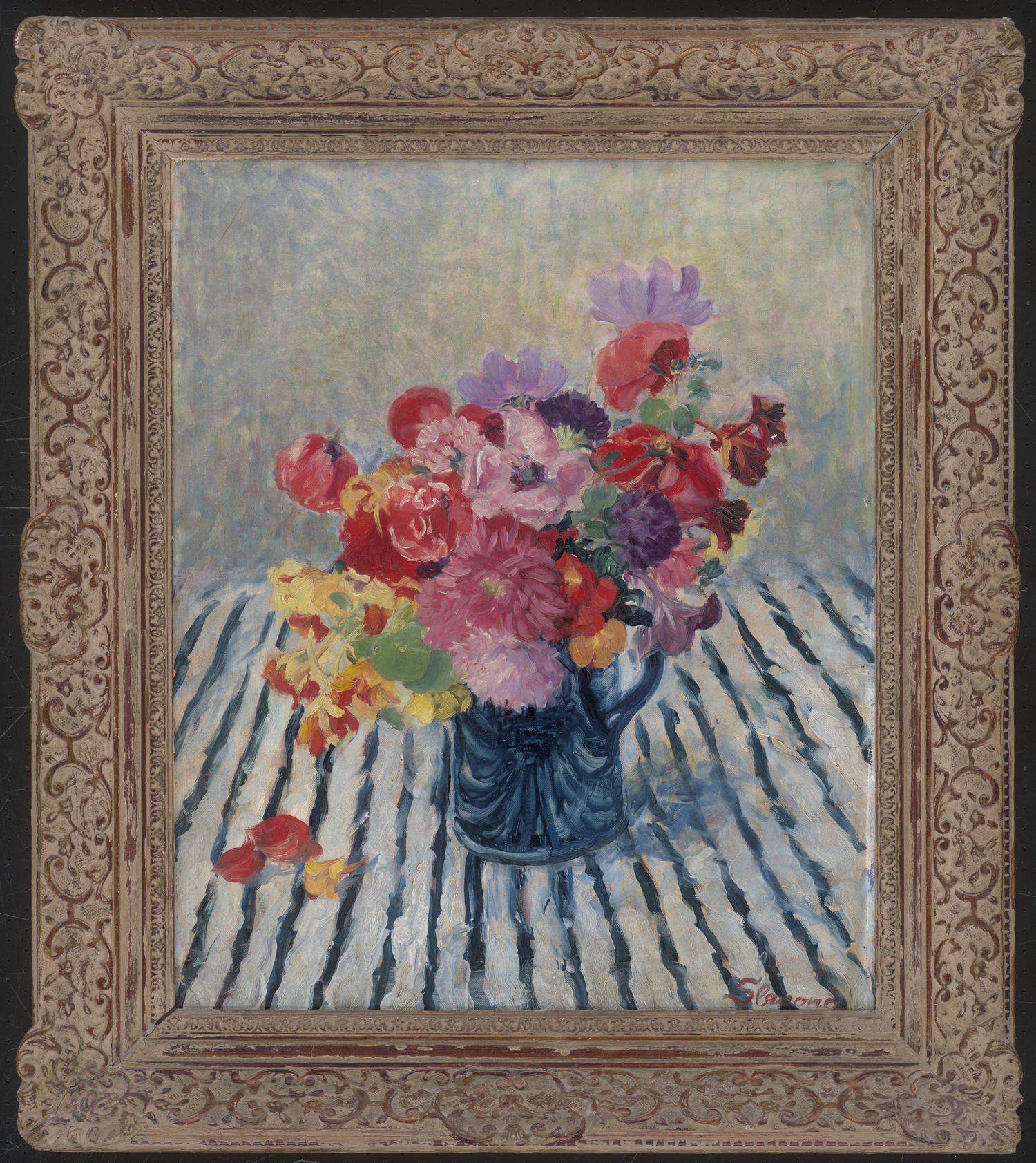 (1865 Lübeck - 1931 Berlin)Blumenstilleben auf einem Tisch mit gestreiftem Tischtuch