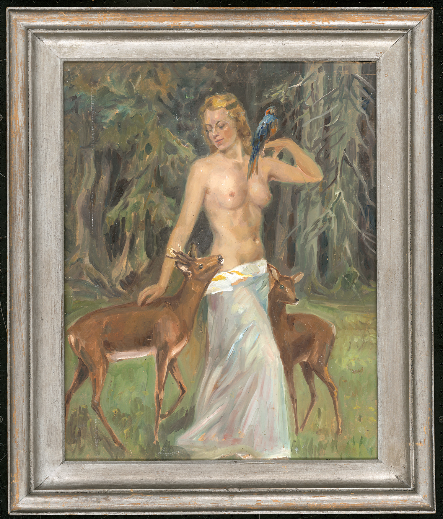 Weiblicher Halbakt mit Rotwild und Papagei.