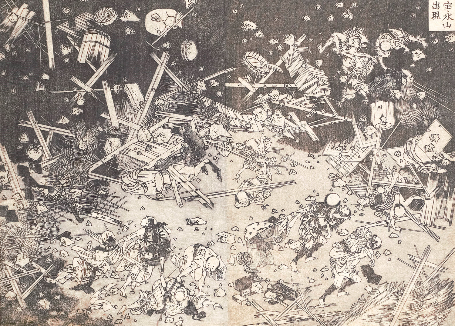 Hokusai, Katsushika. Die Erscheinung von Hoeizan. (Eruptionen des Berges Fuji). Holzschnitt der Serie Fugaku Hyakkei (japonice: 100 Ansichten des Berges Fuji). Von 2 Albumblättern zusammenmontiert. Format chûban tate-e. 22,5 x 26 cm. Unter Kartonpassepartout. Edo (Tokio), Eirakuya Toshiro, um 1860.