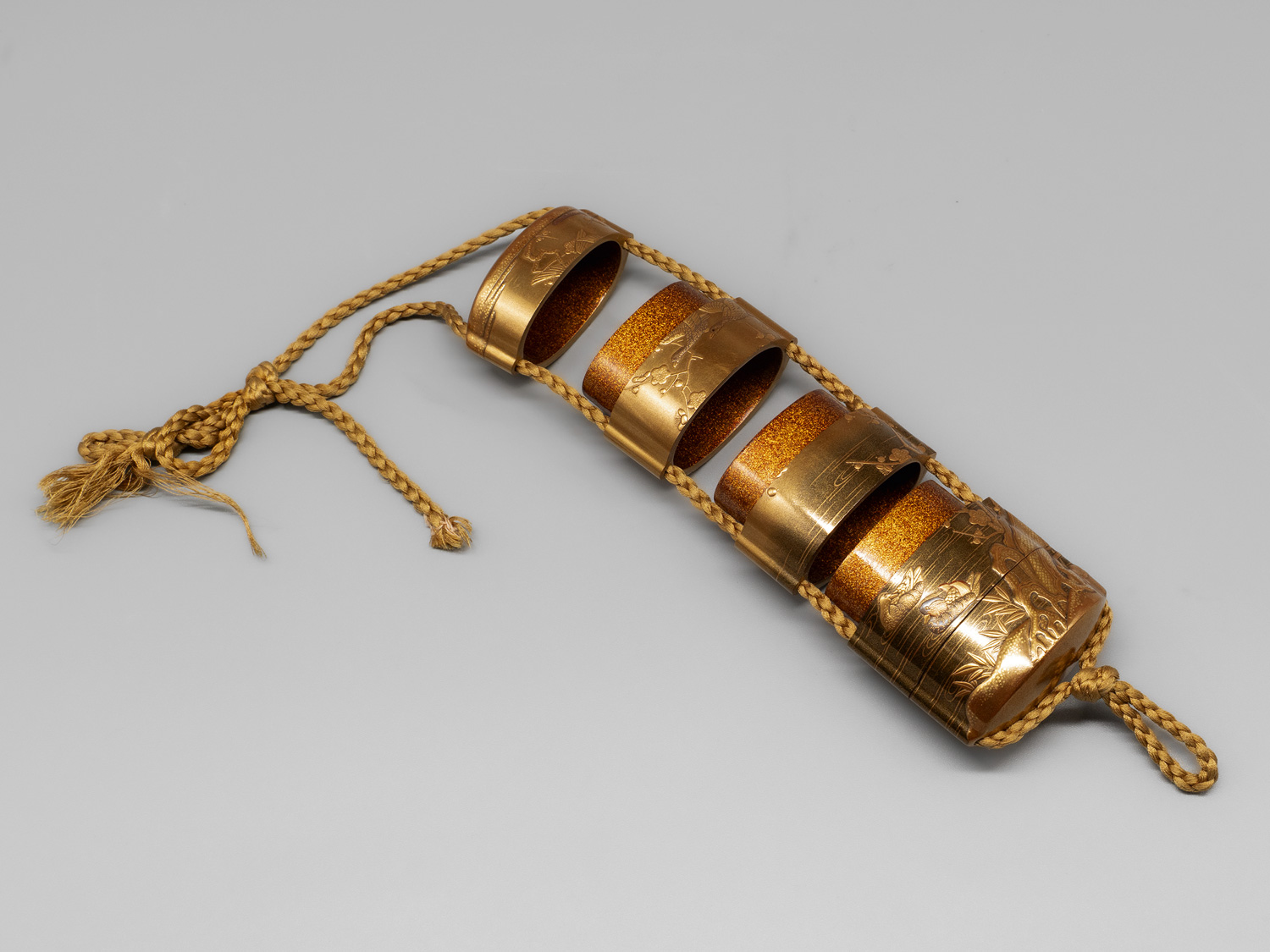 Während die ursprüngliche Funktionalität im Laufe der Edo- und Meiji-Zeit zunehmend in den Hintergrund trat, entwickelte sich das Inrô zu einem Objekt höchster Kunstfertigkeit und zu begehrten Sammlerstücken. Als Statussymbol und representatives Schmuckaccessoir wohlhabender Kaufleute und des Samurai-Standes wurden diese Behältnisse zu aufwendig dekorierten kleinen Kunstwerken, veredelt mit Techniken wie Maki-e (Goldstaublack), Raden (Perlmutteinlage) oder filigranen Gravuren. – Kaum Lackablösungen oder Gebrauchsspuren. In sehr guter Erhaltung. Provenienz: Erworben 1995 beim Kunsthandel Klefisch, danach in Berliner Privatsammlung.