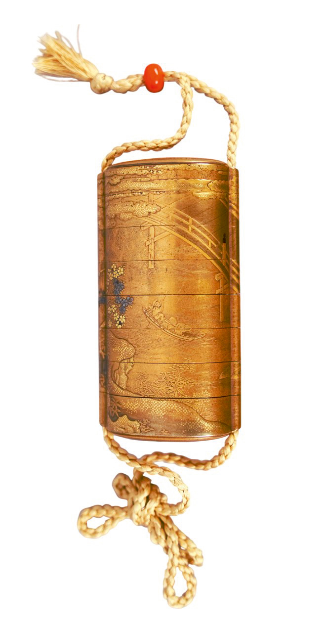 Inrô mit Flussszene. 8-teiliges Aufbewahrungs-Behältnis. Holzgefäß mit Kinji-Goldlackgrund und Hiramakie in Gold und mit Kupfer- und Silberstiftintarsien, darstellend eine Brücke am Fluss mit einem Ruderer. Innen Nashiji-Streulack in Goldbraun. 10 x 5 x 3 cm. Mit beigefarbener Flecht-Kordel sowie einer orangefarbenen Ojime-Schmuckperle. Japan, Meiji-Zeit, 19. Jahrhundert.