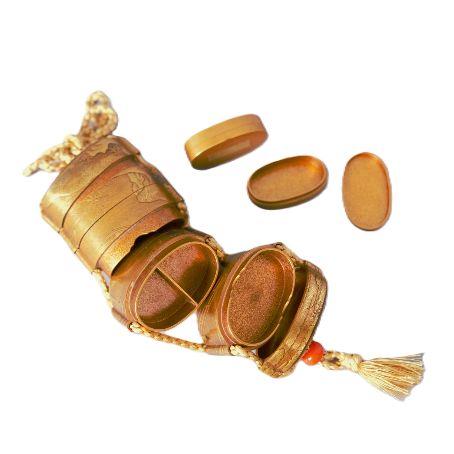 Während die ursprüngliche Funktionalität im Laufe der Edo- und Meiji-Zeit zunehmend in den Hintergrund trat, entwickelte sich das Inrô zu einem Objekt höchster Kunstfertigkeit und zu begehrten Sammlerstücken. Als Statussymbol und representatives Schmuckaccessoir wohlhabender Kaufleute und des Samurai-Standes wurden diese Behältnisse zu aufwendig dekorierten kleinen Kunstwerken, veredelt mit Techniken wie Maki-e (Goldstaublack), Raden (Perlmutteinlage) oder filigranen Gravuren. – Kompartimente teils etwas sperrig, von den drei winzigen Innendöschen fehlt möglicherweise ein Korpus (Deckel vorhanden), die Silberstiftintarsien im Dekorum sind oxidiert, sonst kaum Handhabungsspuren oder Lackablösungen.