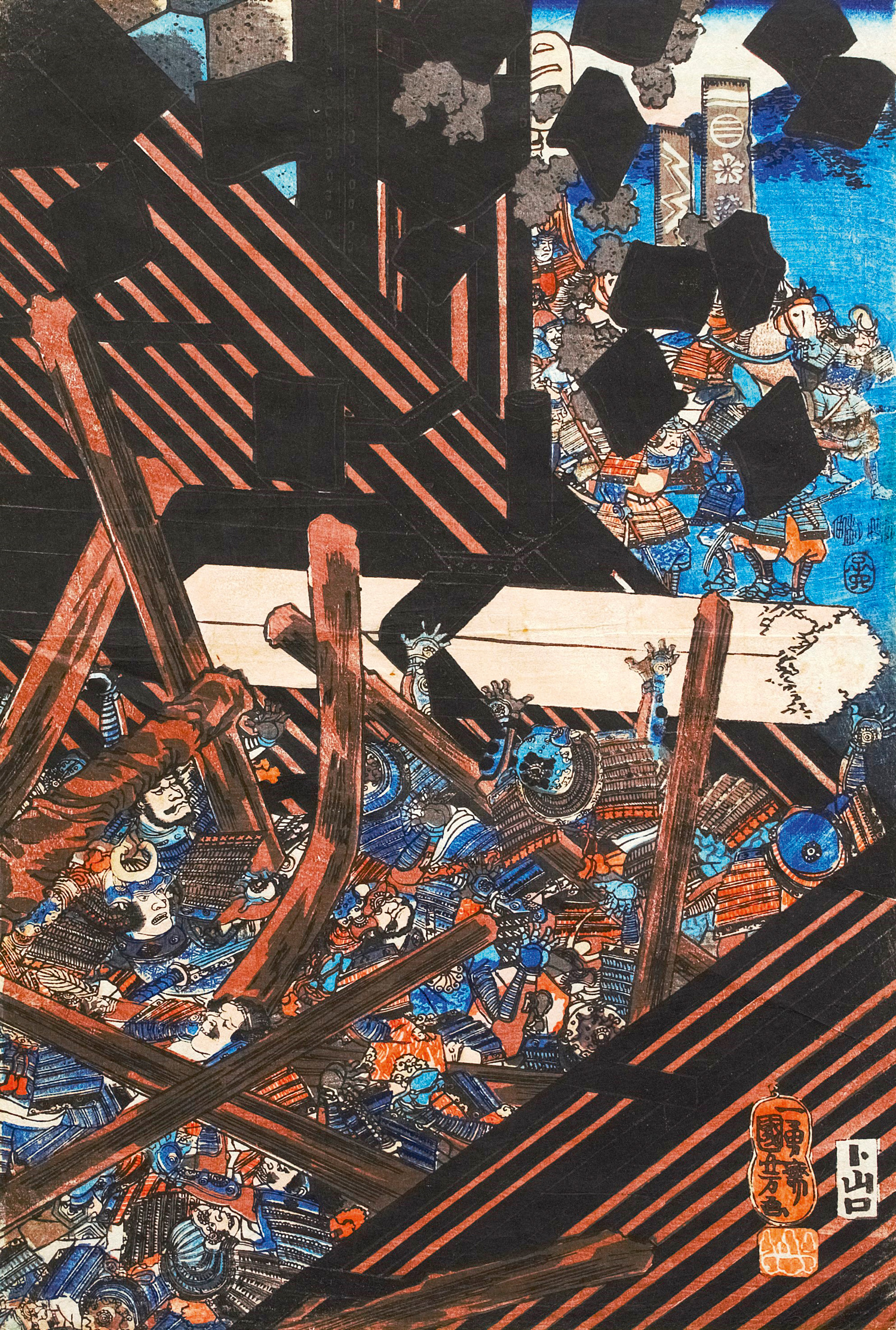 Vorhanden sind: I. Samurai-Gefechtsszene in einem einstürzenden Bauwerk. - II. Nach einem Kampf bei Nacht - III. Kriegsszene mit attakierenden Schwertkämpfern. - IV. Feuergefecht auf einem Schlachtfeld. – Leichte Knickspuren oder Randläsuren, aber insgesamt wohlerhalten. Überaus frische Farbdrucke.