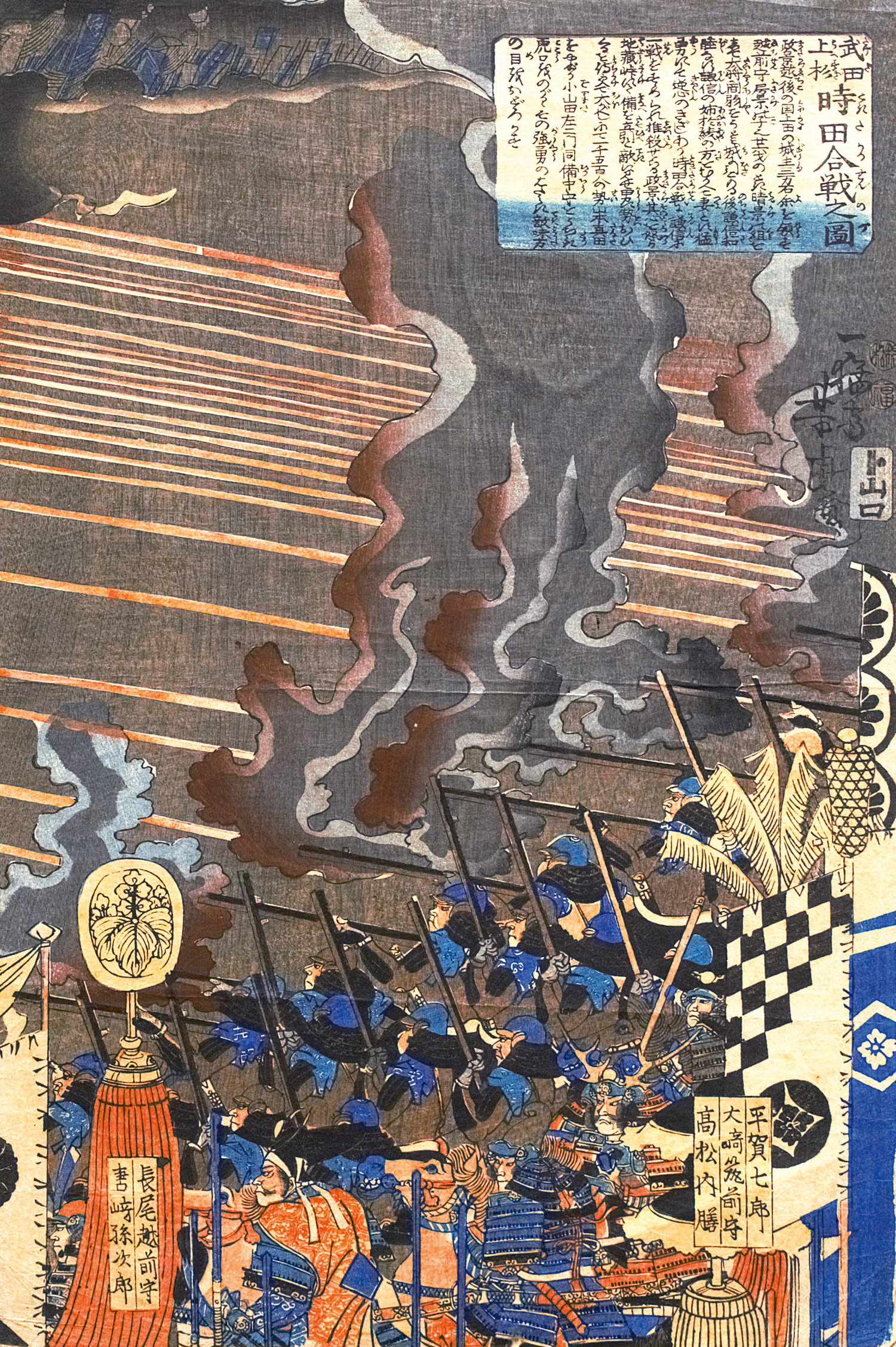 Vier dramatisch-dynamische Farbholzschnitte, überwiegend von Utagawa Kuniyoshi (1798-1861), die Samurai und Krieger mit Schwertern oder Gewehren in martialischen Szenen einfangen.