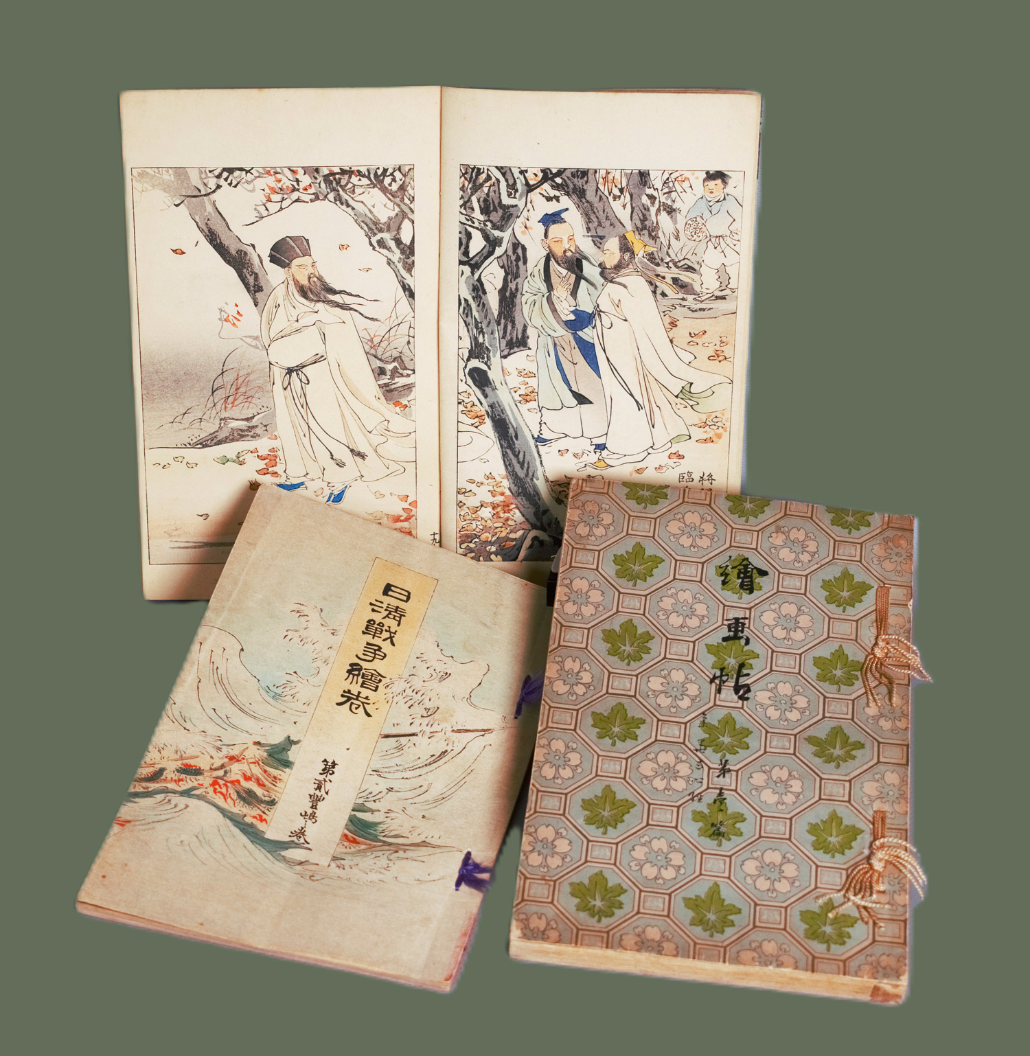 Kirschblüten zu Hinami, Geishas, eine Brücke über das Tal, Philosophen im Wald, Tanz der musizierenden Japaner, der Alte mit dem Reiher und vieles mehr, aus der Sammlung der "Bijutsu sekai", der Kunstmaler, die ihre Welt darstellen. - Nishin Senso emaki. 2. Teil. "The Battles between Japan and China. Vol. II. Asan Sea". 15 Doppelblätter mit kalligraphischem Text und 14 Farbholzschnitten (teils zu doppelseitigen Motiven). Tokyo, Shun Yo Do, o. J. (1896). - Berühmtes Bilder-Textbuch zum Ersten Japanisch-Chinesischer Krieg vom 1. August 1894 bis April 1895, von dem Künstler Kwason Suzuki. - Etwas stärker angestaubt und mit Vertikalknick. – Minimale gebräunt, meist sauber, insgesamt gute Exemplar mit den Holzschnitten in ausgezeichneter, kraftvoller Farbigkeit.