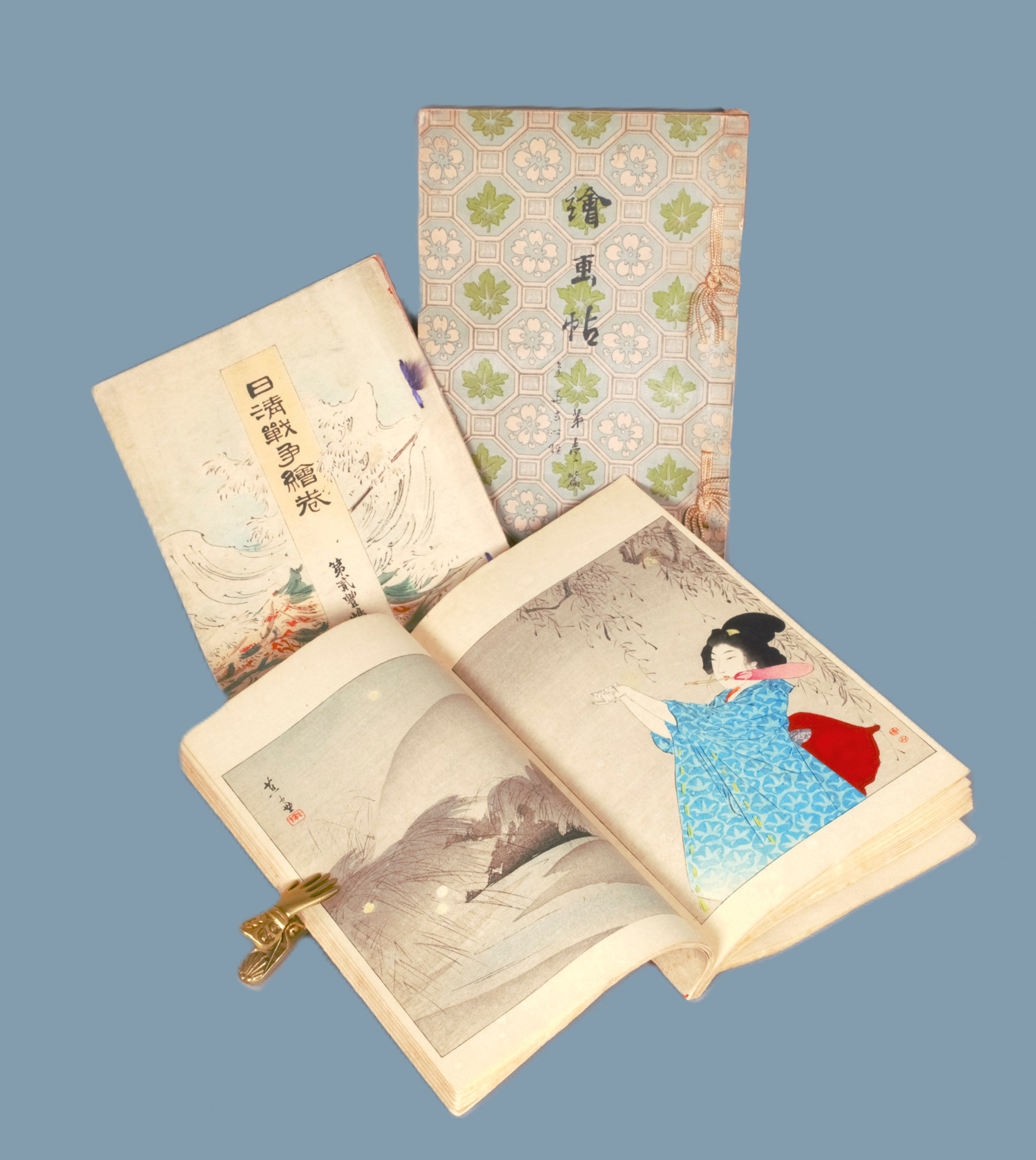 1) Chogami E-Man. 1 Band der Reihe. 26 Doppelblätter mit kalligraphischem Text und 44 Farbholzschnitten (teils zu doppelseitigen Motiven). Tokyo um 1892. - Bilderbuch der japanischen Kunst zur Meji-Zeit, wohl aus der Reihe der 10.000 Skizzen, darunter Farbholzschnitte nach den großen Ukiyo-e Meistern wie Hokusai und anderen. Vogel-, Fisch- und Rinderdarstellungen, wechseln mit leuchtenden Interieurs, Schneelandschaften mit dem Fuju und vielem mehr, teils mit Prägedruck. - 2) Bijutsu sekai. 1 Band der Reihe. 16 Doppelblätter mit kalligraphischem Text und 25 Farbholzschnitten (teils zu doppelseitigen Motiven). Tokyo um 1870.