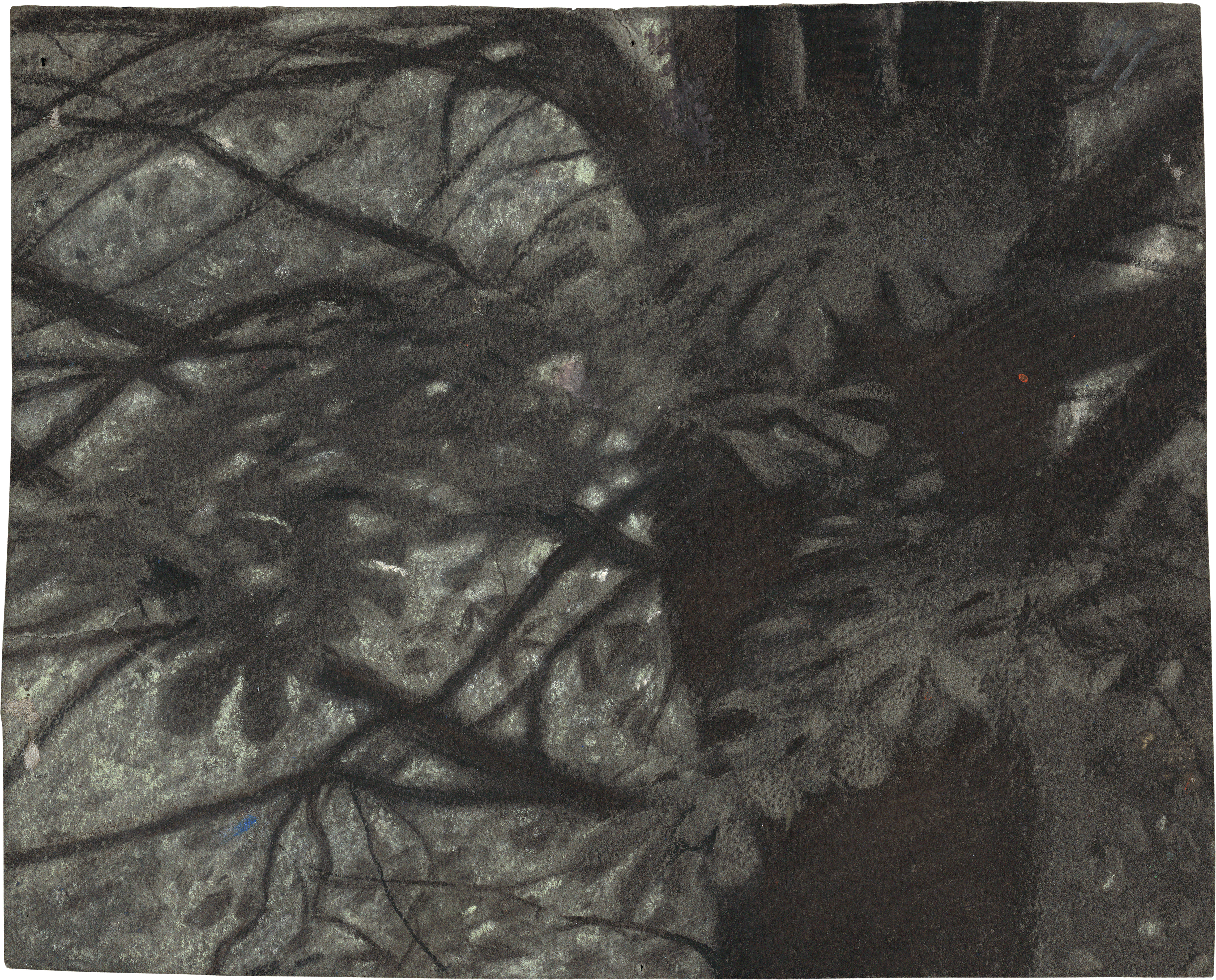 Schwarze und weiße Kreide auf blaugrünem Papier. 11,5 x 14,5 cm.