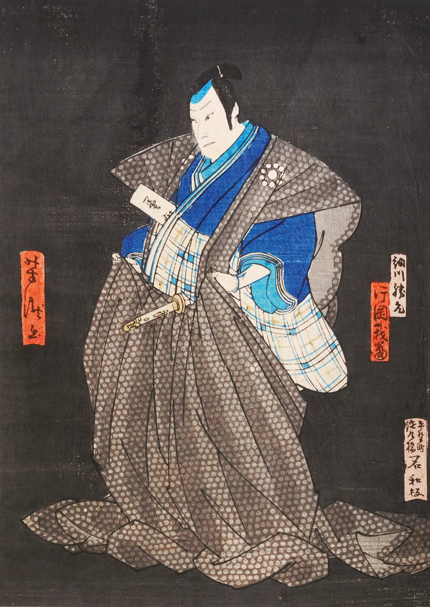 Der Holzschnitt zeigt einen Kabuki-Darsteller in Ganzfigur vor einem monochromen schwarzen Grund. Er ist in einen weiten, grau-gepunkteten Umhang gehüllt, darunter trägt er einen blauen Kimono. Aus den Falten seines Gewandes ragt der Griff seines Katana hervor. – Auf Japan aufgezogen. Überaus farbkräftig.