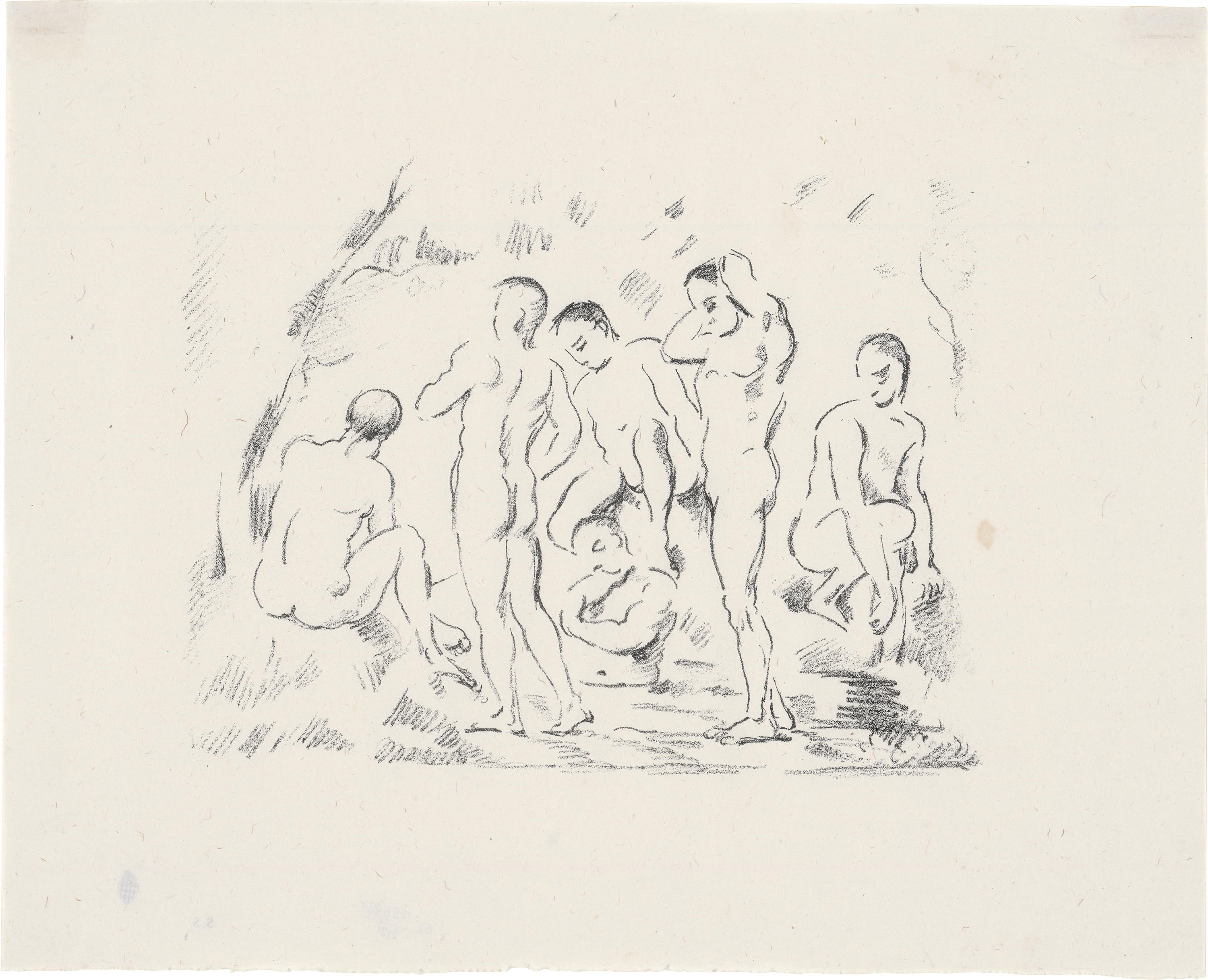 Seit seiner ersten Darstellung des Themas in den 1870er Jahren griff der Künstler das Motiv der Badenden immer wieder auf. Da er selten mit lebenden Modellen arbeitete, entwarf er seine Aktszenen in Landschaften meist aus der Phantasie oder orientierte sich an kunsthistorischen Traditionen. Cézanne verleiht seinen silhouettenhaft erscheinenden Badenden in der klaren, puren Version des ersten Zustandes, noch vor den Farben, eine zeitlose Qualität. Cherpin notiert für diesen Zustand vor der lithographierten Signatur eine kleine Auflage von wohl lediglich 10 Exemplaren; die farbige Version erschien in "L'Album d'estampes originales de la Galerie Vollard", 1897, in einer Auflage von 100 Exemplaren. Insgesamt schuf Cézanne nur drei lithographische Arbeiten. Ebenso wie die beiden weiteren Blätter verlegte Ambroise Vollard auch die "Petits baigneurs" und regte vermutlich damit Cézanne entscheidend in seinem graphischen Schaffen an. Prachtvoller, klarer Druck mit sehr breitem Rand, unten mit dem Schöpfrand. Äußerst selten.